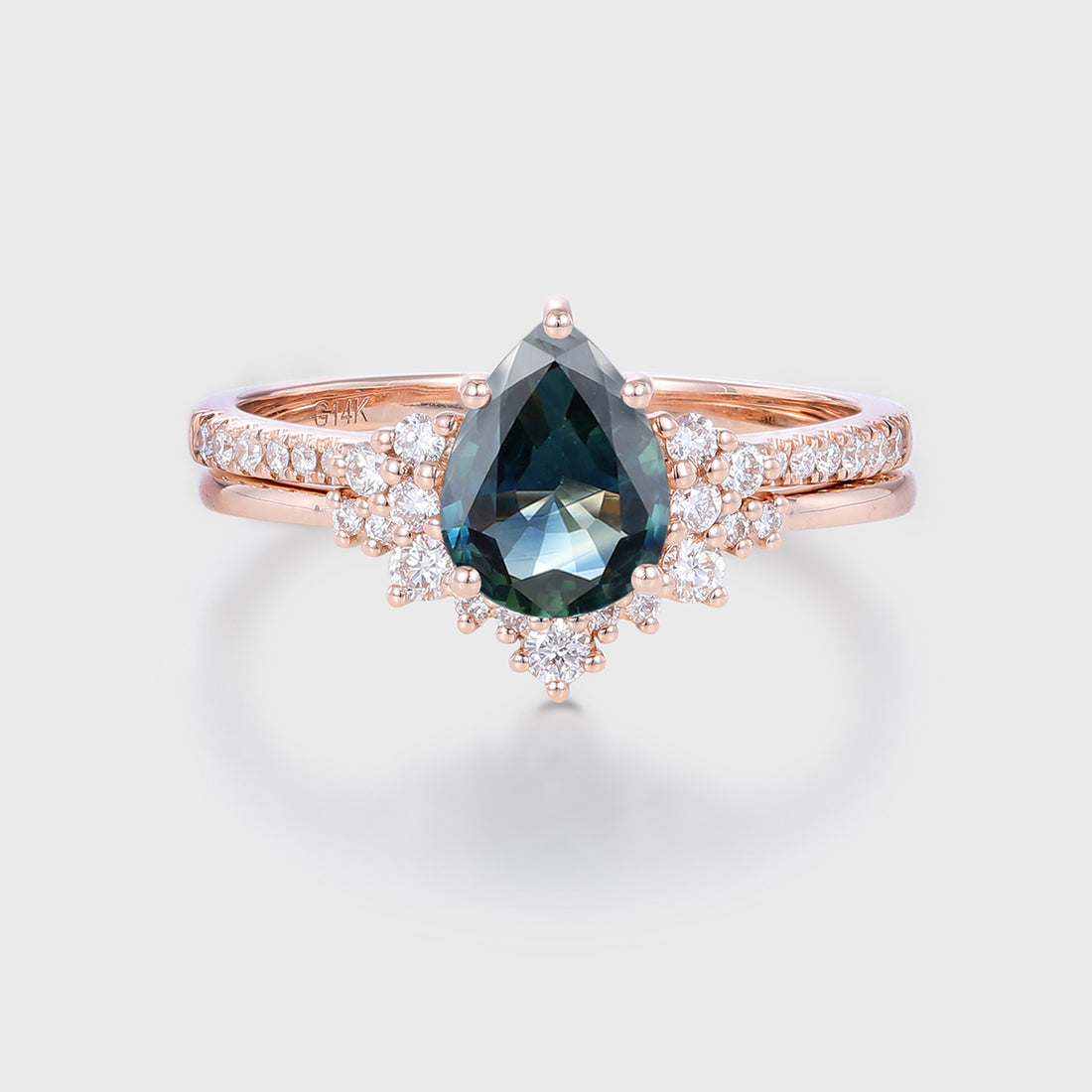 Pear Cut Blue Green Sapphire Matching Moissanite | Diamonds Gold Bridal Set