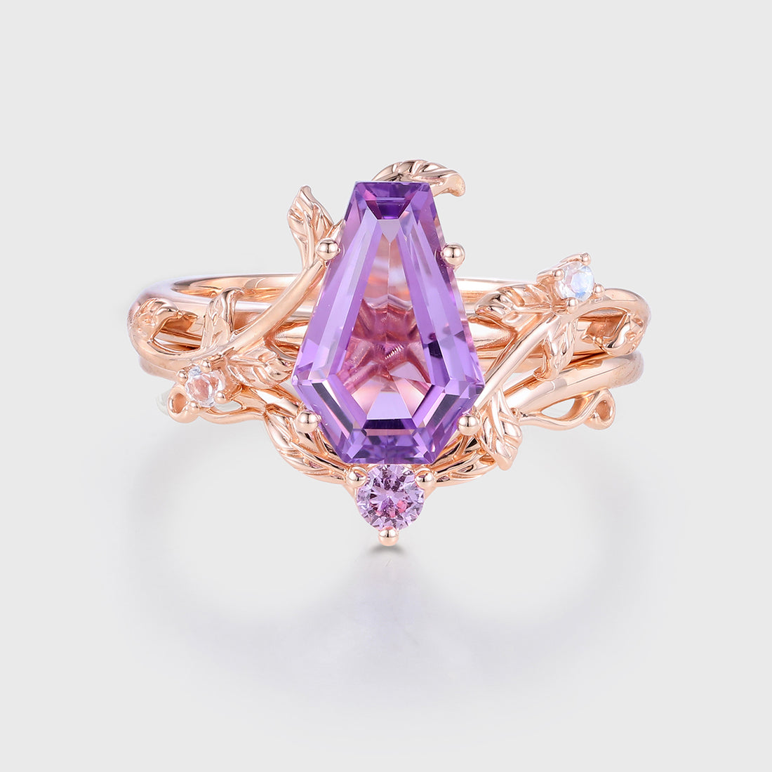 Coffin Cut Amethyst + Natural Pink Sapphire Wedding Bridal Set