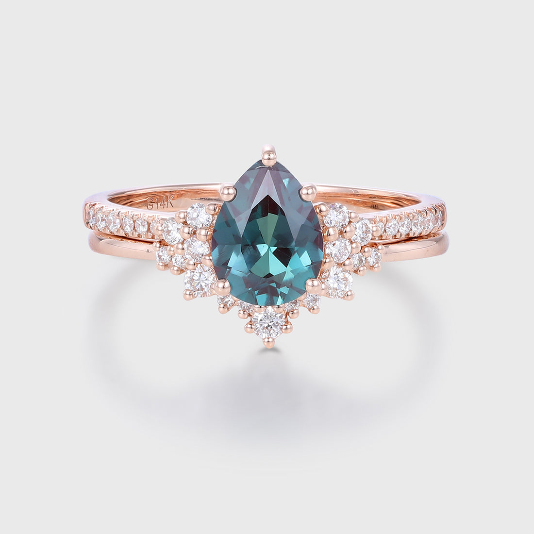 Pear Cut Lab Alexandrite Matching Moissanite | Diamonds Gold Bridal Set