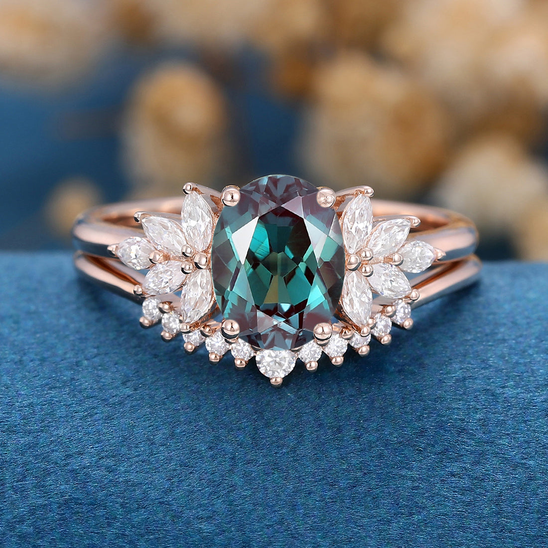 2PCS Oval Alexandrite cluster Engagement ring Bridal Set