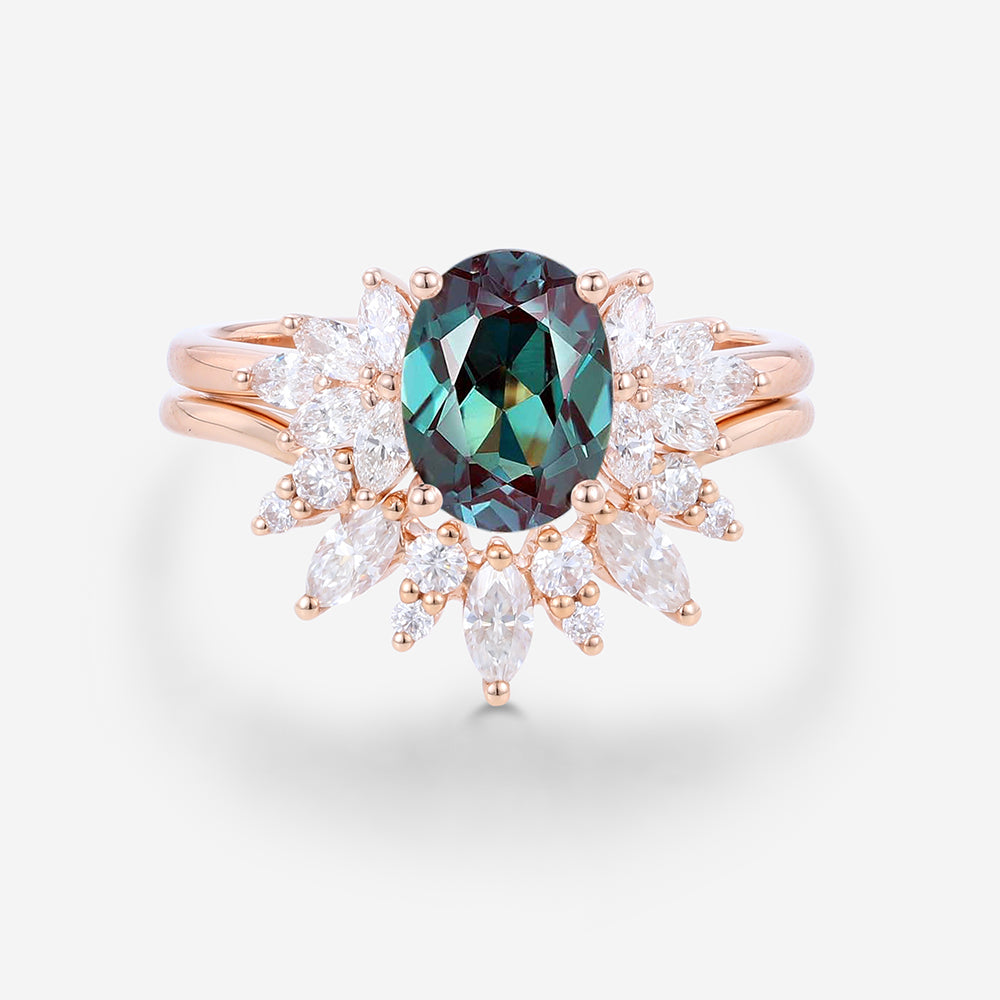 1.5Carat Oval Alexandrite Cluster Engagement ring Bridal Set