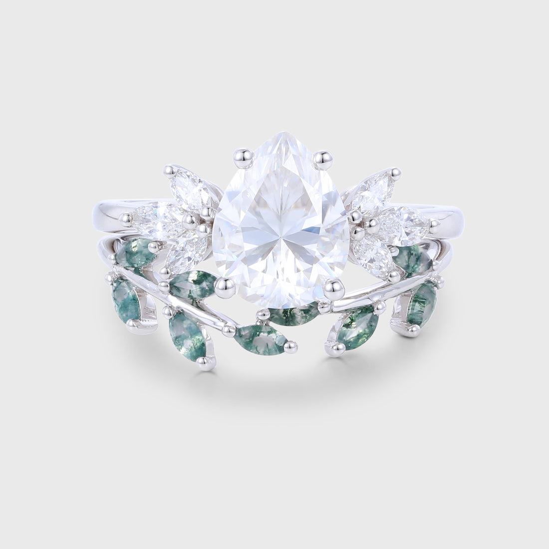 1.2 Carat Pear Moissanite + Moss agate Cluster | Diamonds wedding Bridal Set