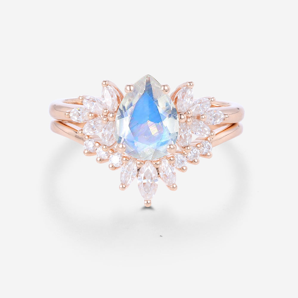2PCS Pear Moonstone Engagement Ring Bridal Set