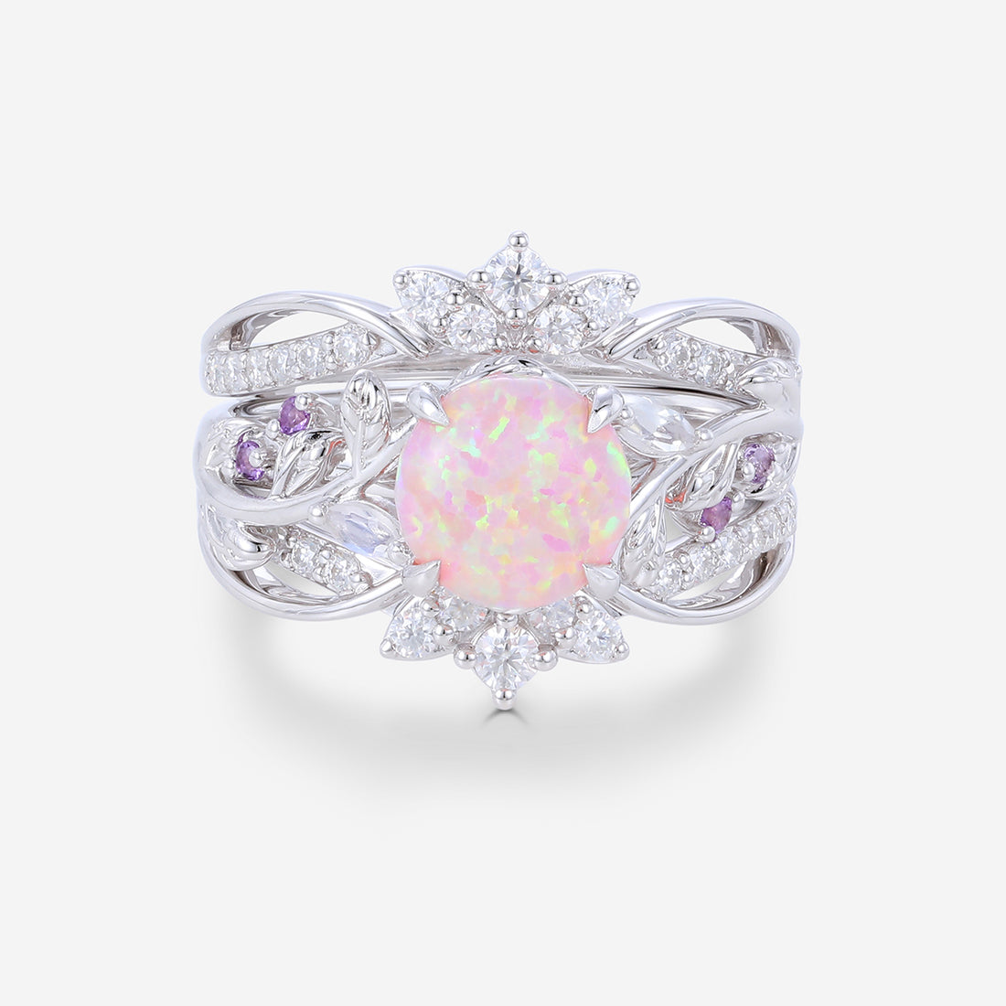 Nature Inspired Round cut Moss Agate Leaf Gold ring set