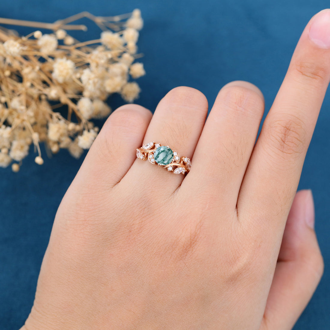 Nature Inspired Round cut Moss Agate Matching Moissanite | Diamonds twig Engagement Ring