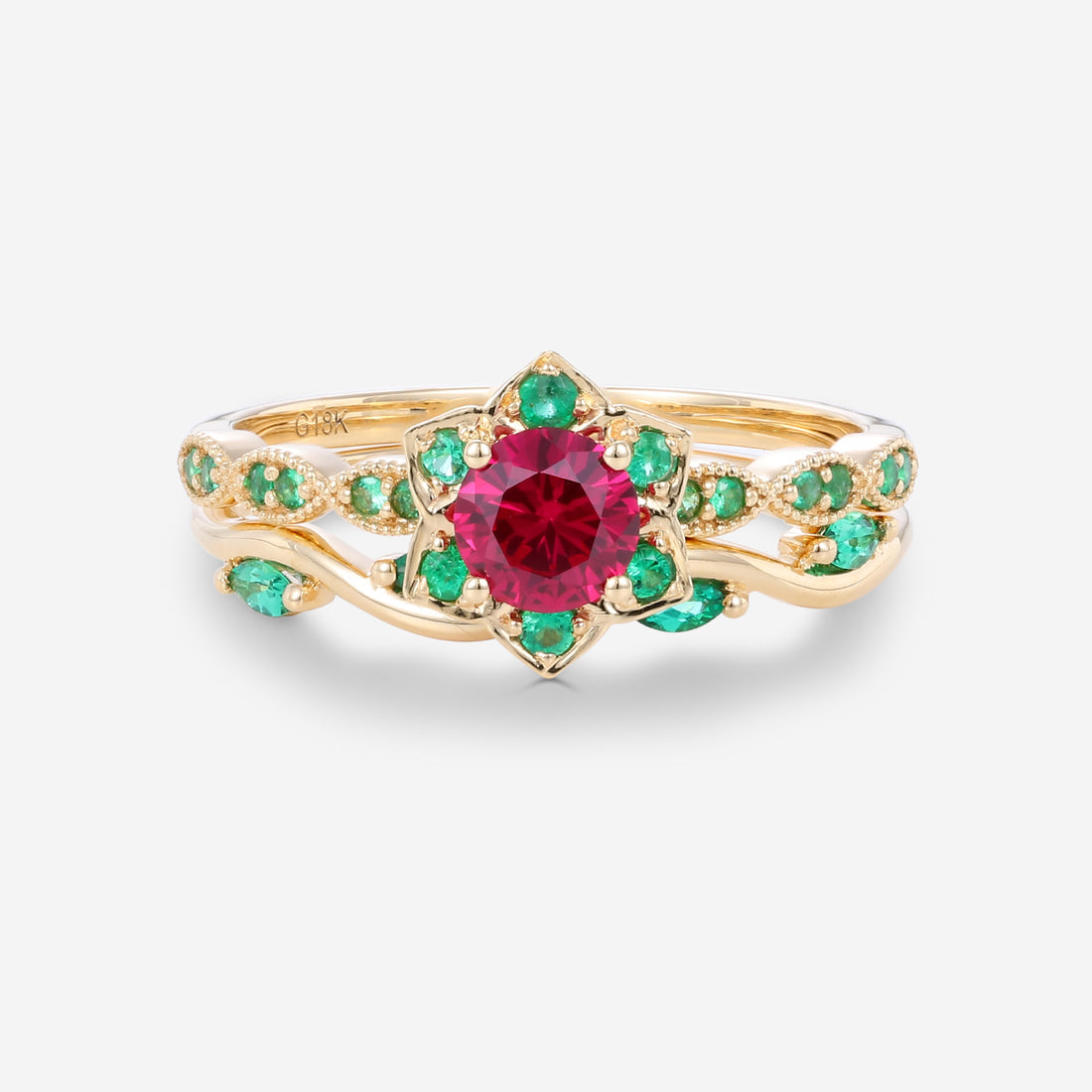 Round Cut Lab Ruby Flower Wedding Bridal Set