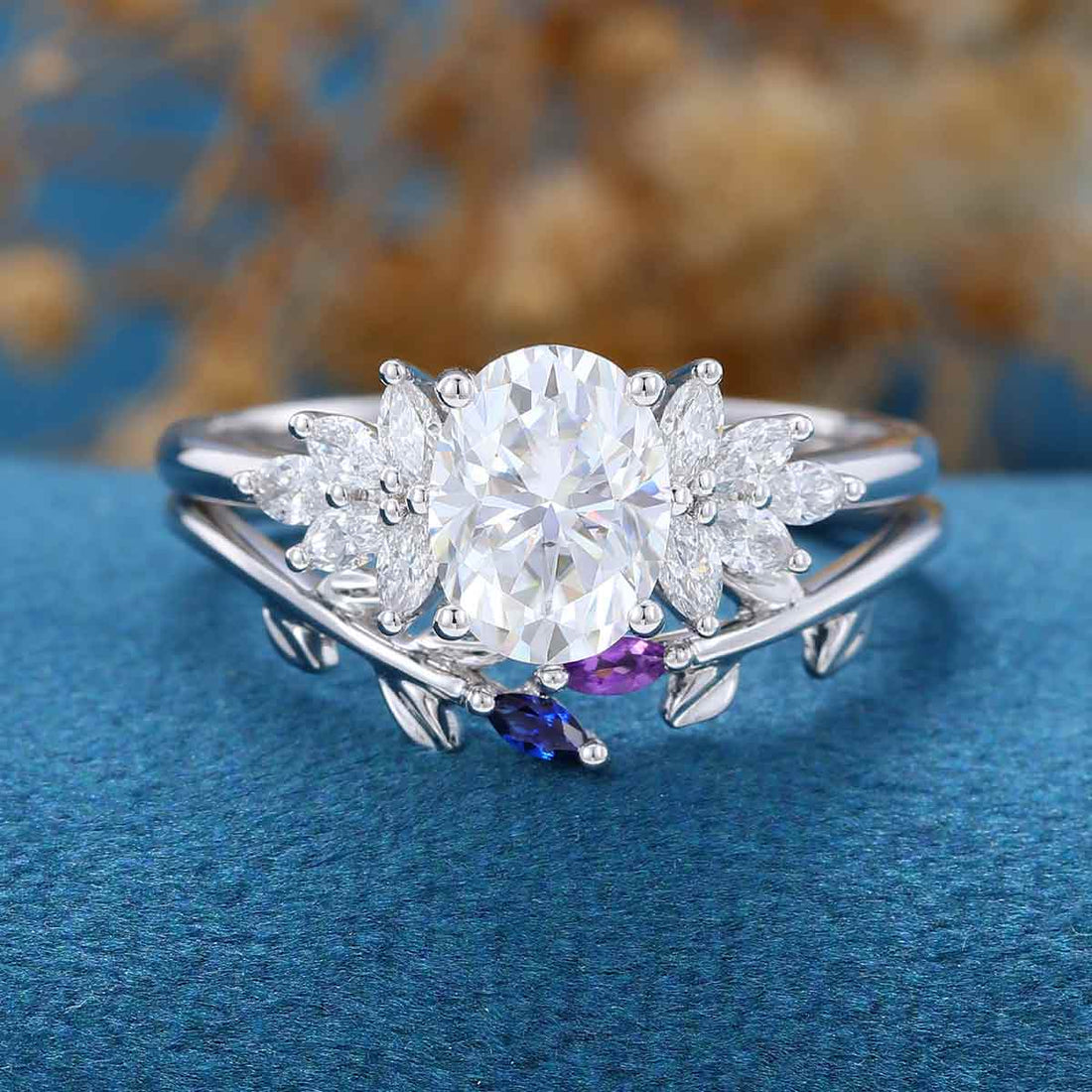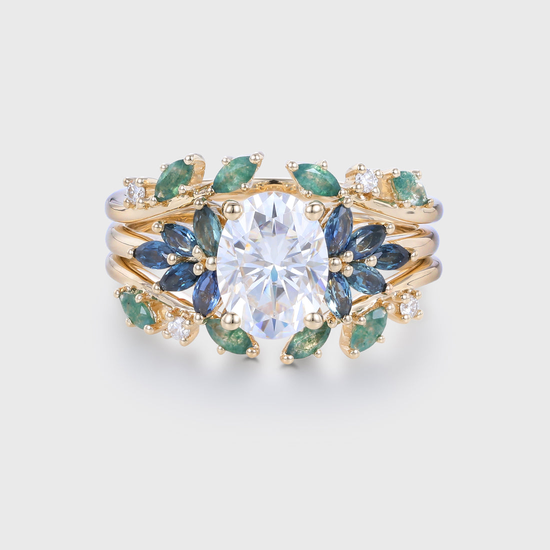 1.5Carat Oval Cut Moissanite+ Moss Cluster Engagement ring Bridal Set
