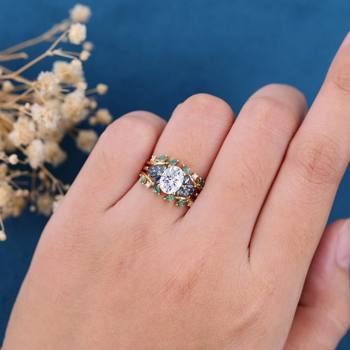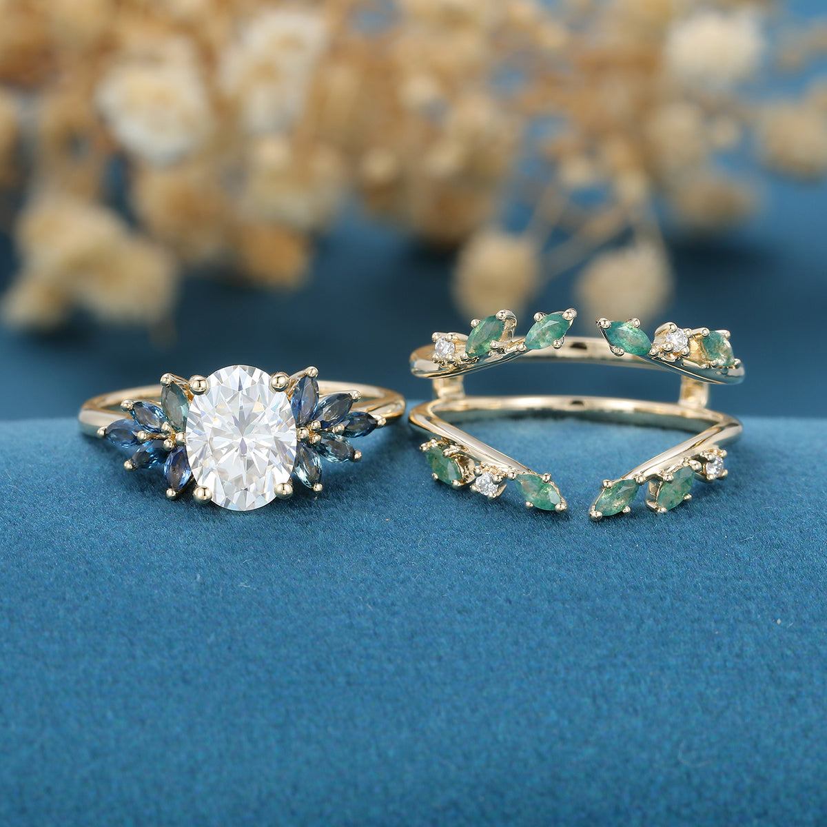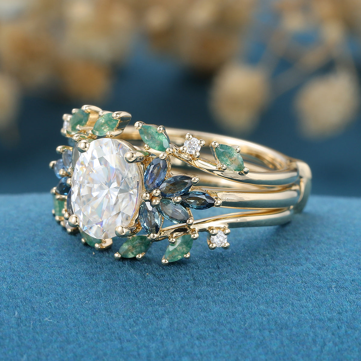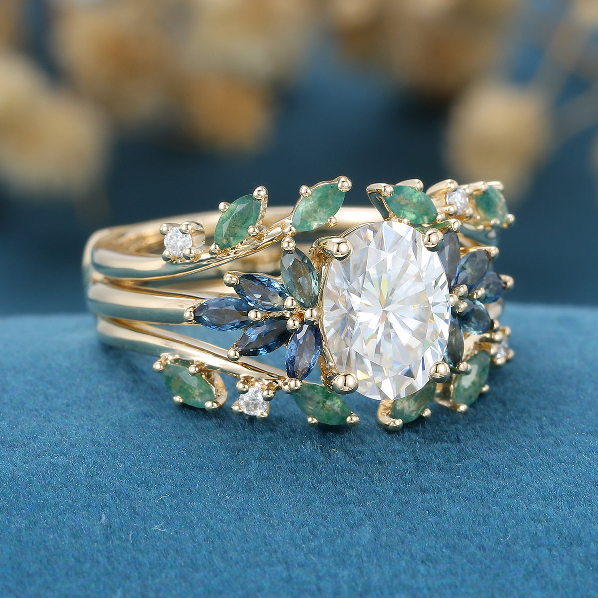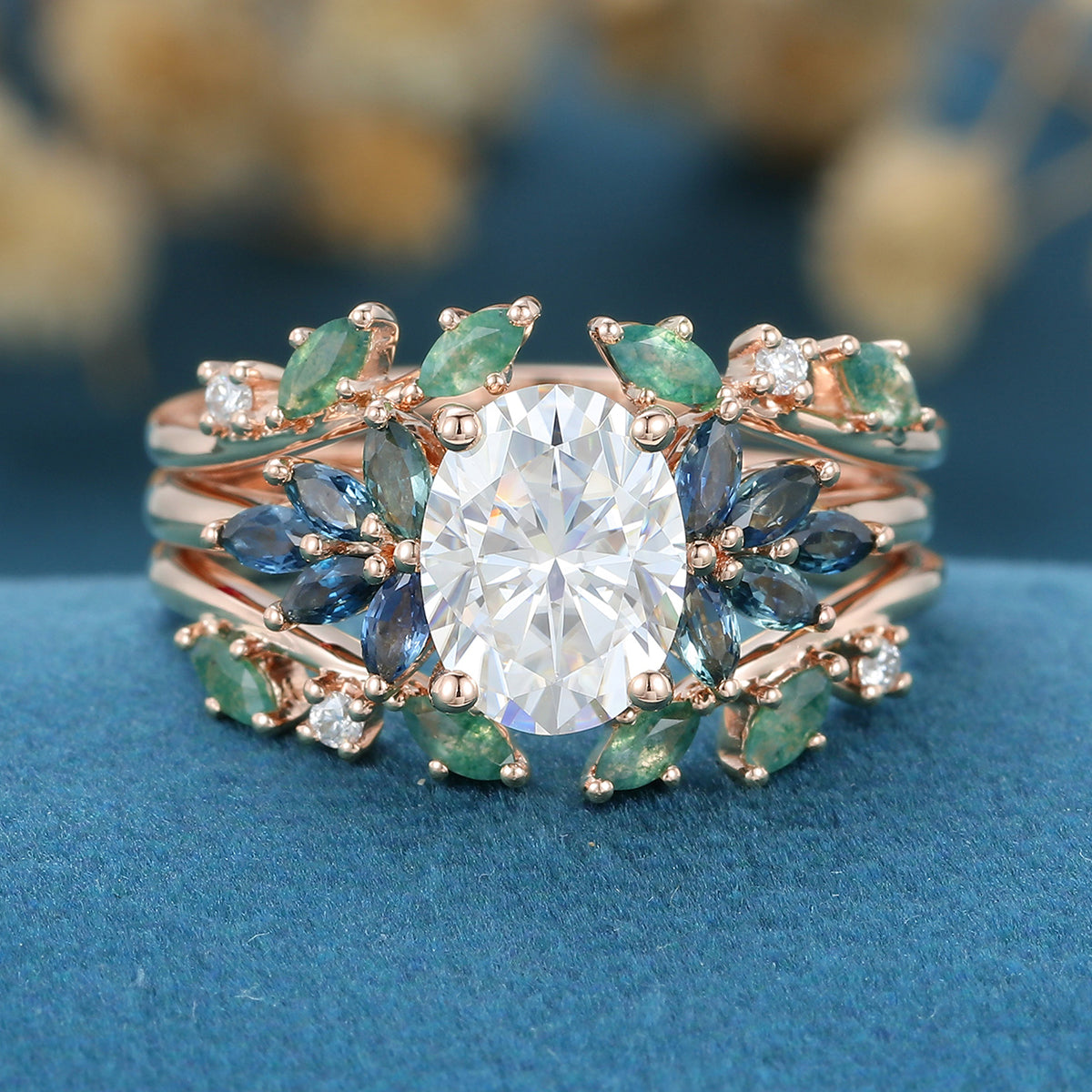 1.5Carat Oval Cut Moissanite+ Moss Cluster Engagement ring Bridal Set