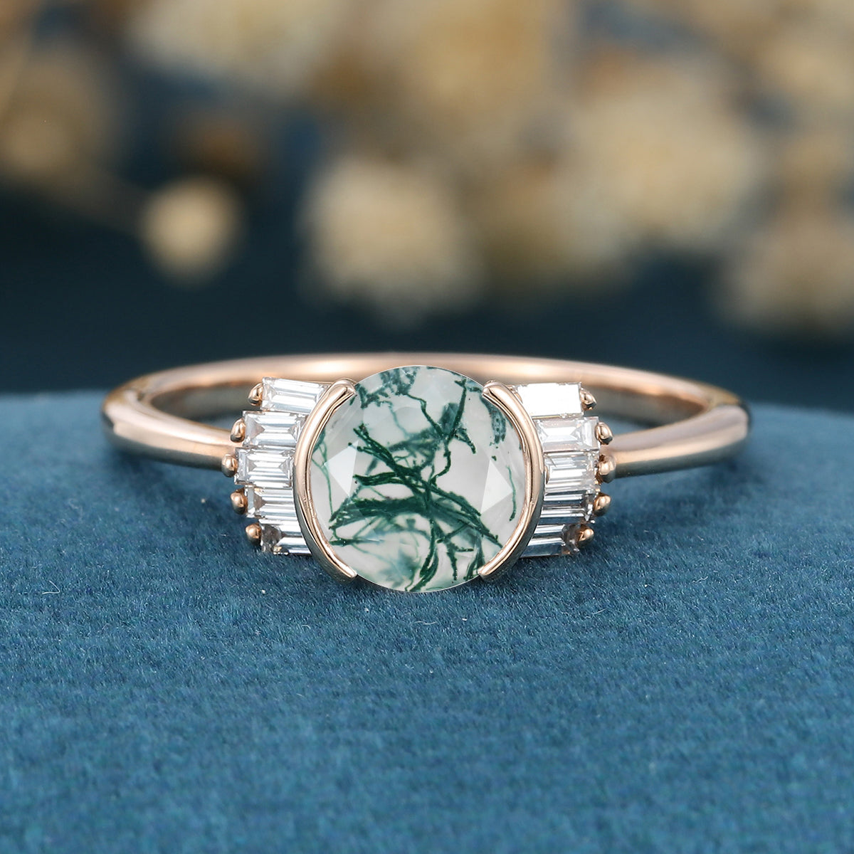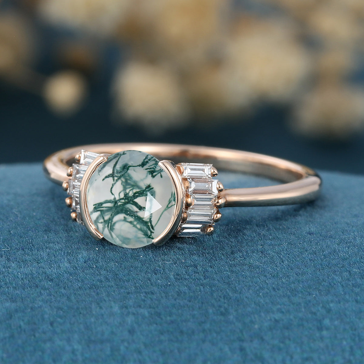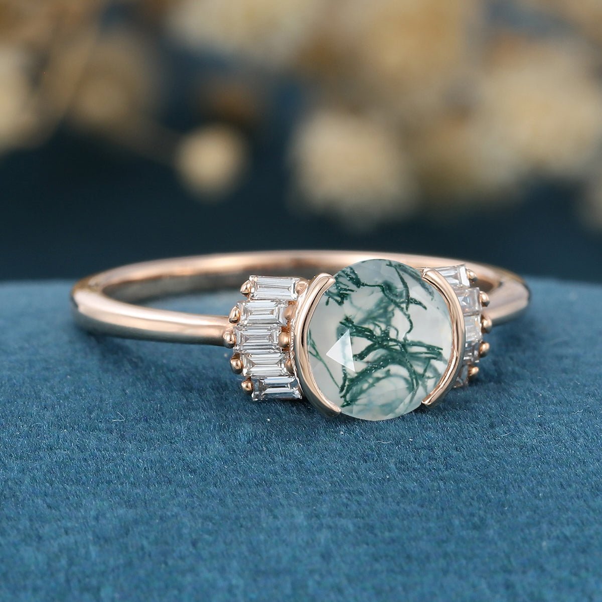 Bezel Set Rose cut Moss Agate Gold Engagement Ring