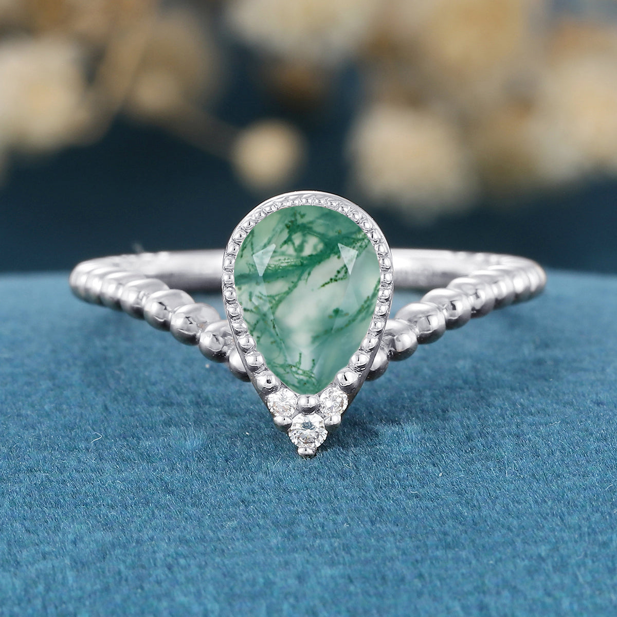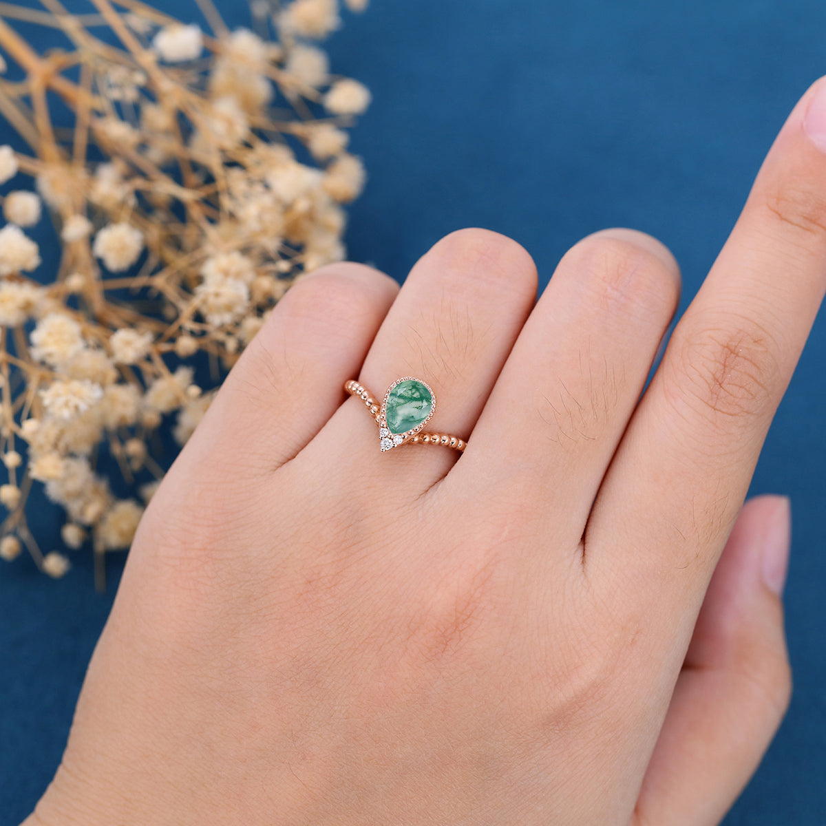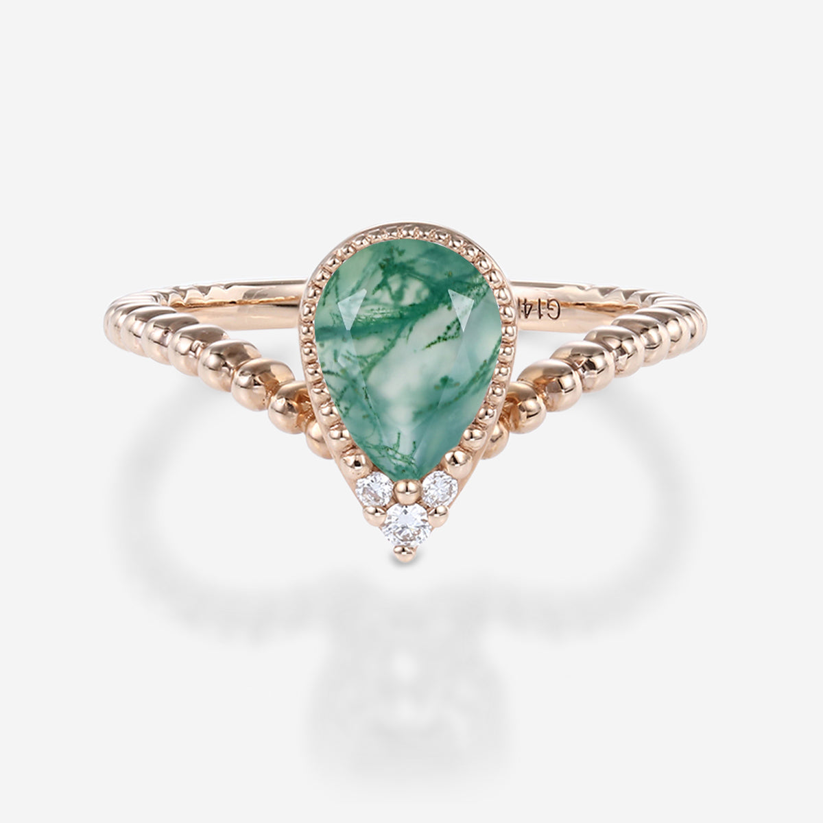 Type: Moss Agate 1.2 Carat Size: 6 x 8 mm Shaped: Pear cut The band Width: 1.7 mm | Thickness :1.2 mm Total weight: 2.6 g(Depending on the ring size) |