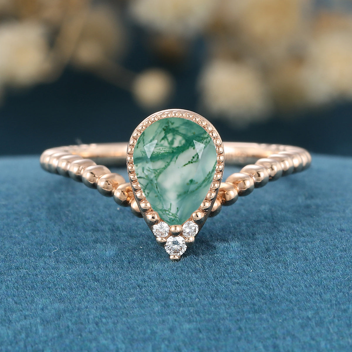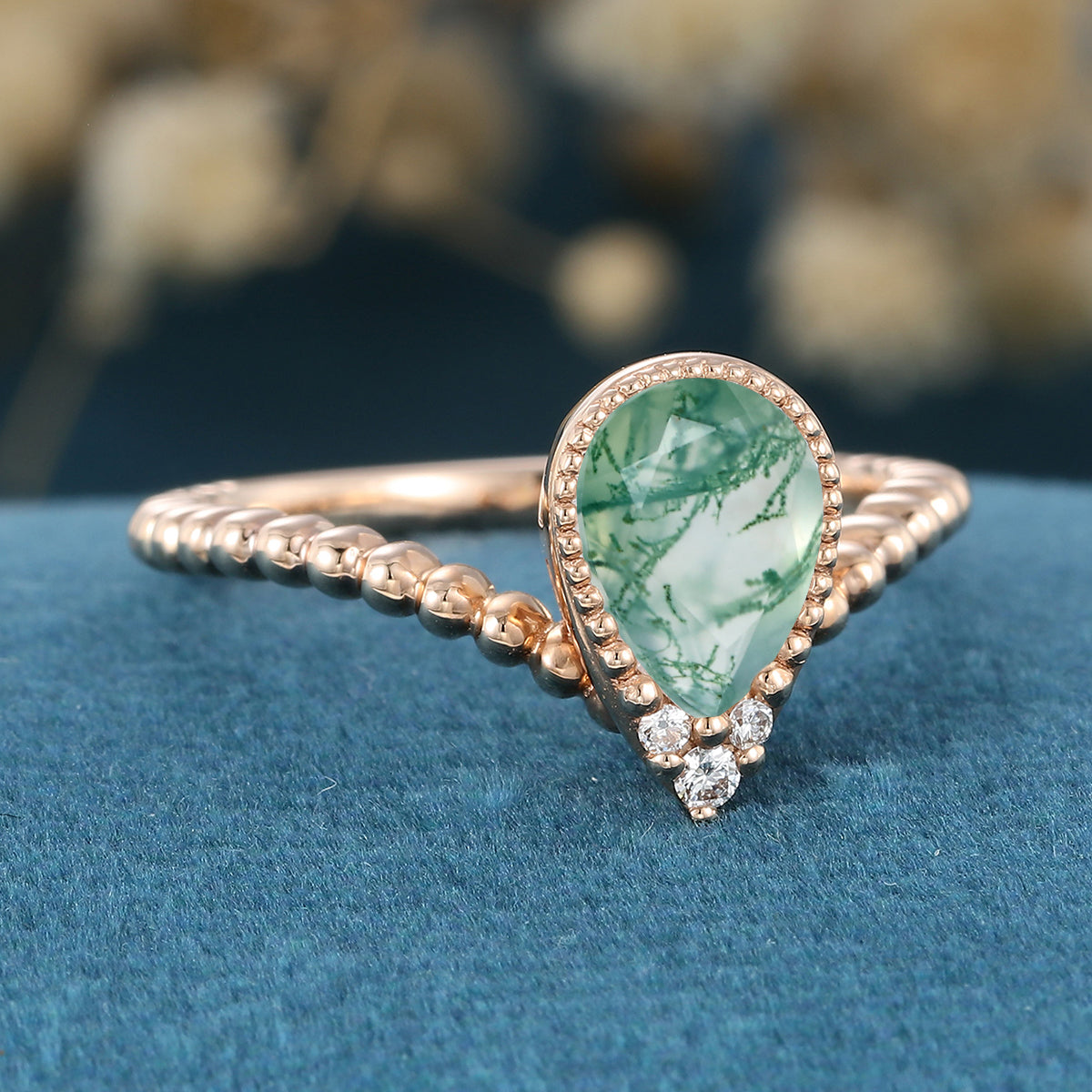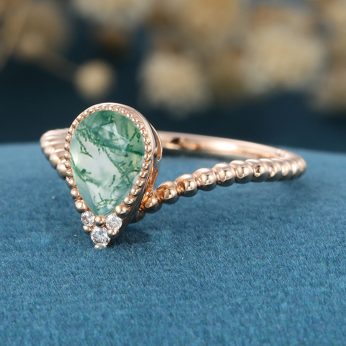 Type: Moss Agate 1.2 Carat Size: 6 x 8 mm Shaped: Pear cut The band Width: 1.7 mm | Thickness :1.2 mm Total weight: 2.6 g(Depending on the ring size) |