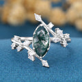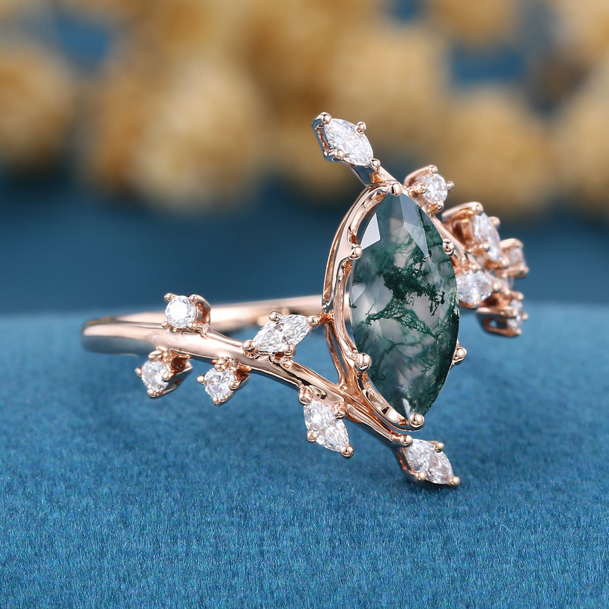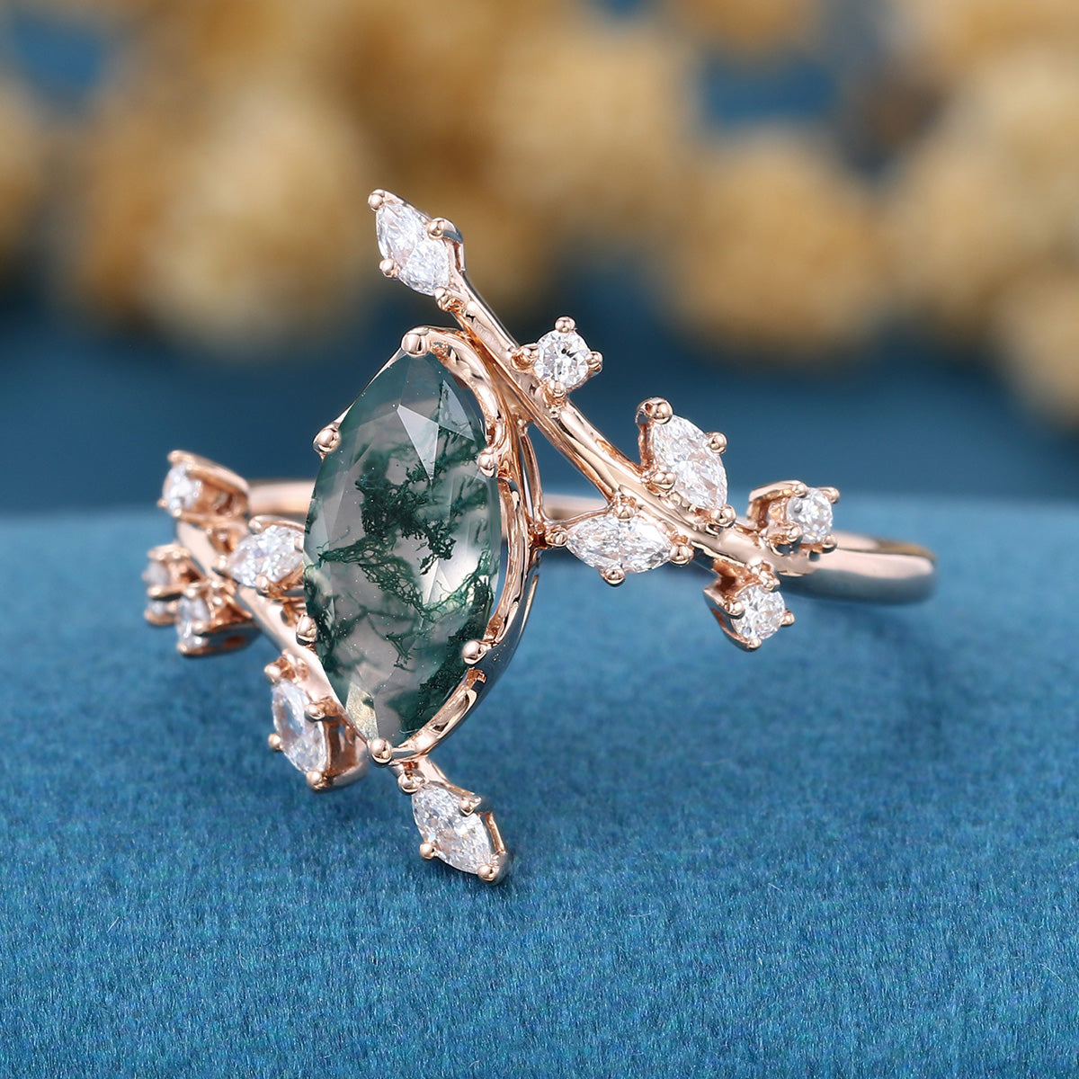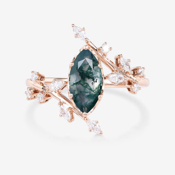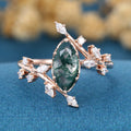 Bezel setting Marquise cut Moss Agate Rose Gold Engagement Ring