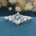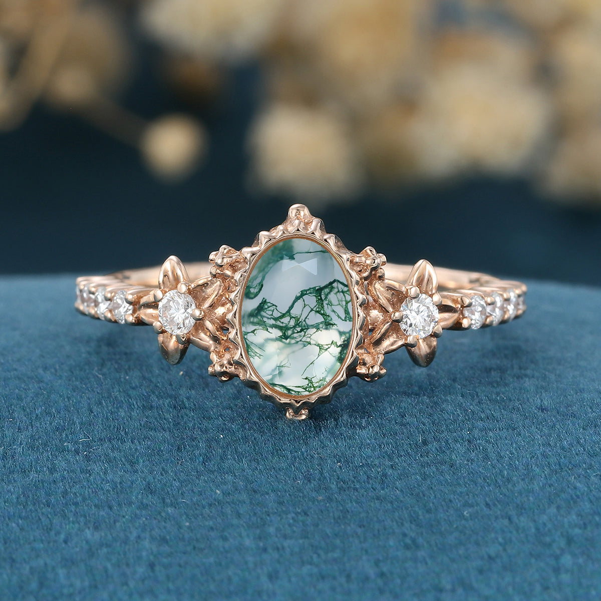 Bezel setting Oval cut Moss Agate Halo Moissanite | Diamonds Gold Engagement Ring