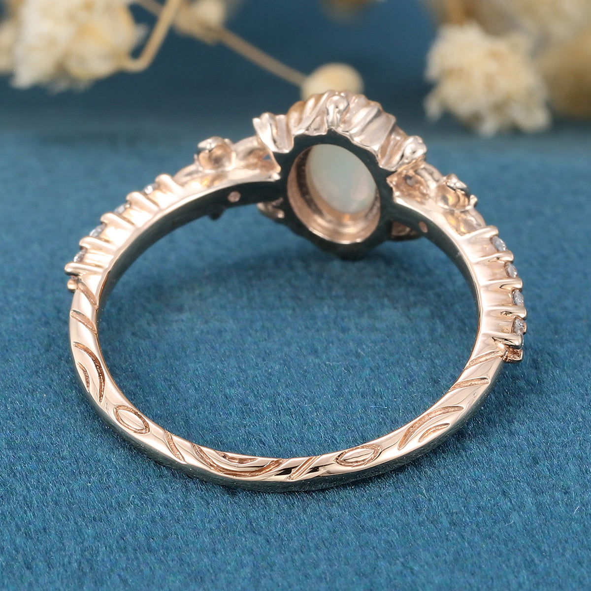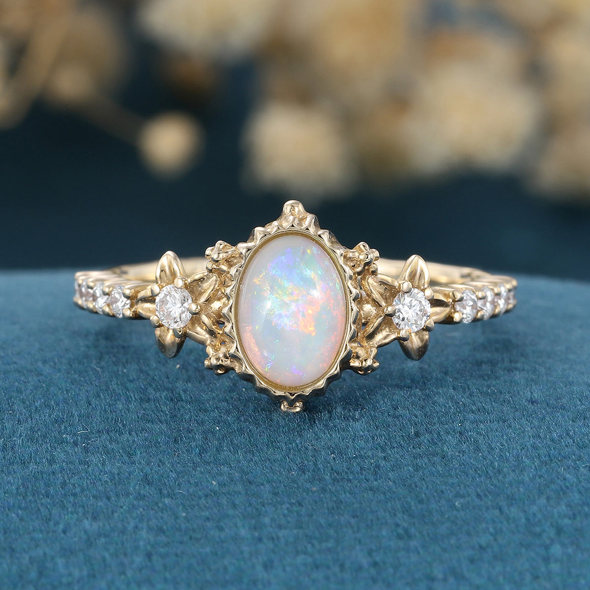 Bezel setting Oval cut Opal Halo Moissanite | Diamonds Gold Engagement Ring