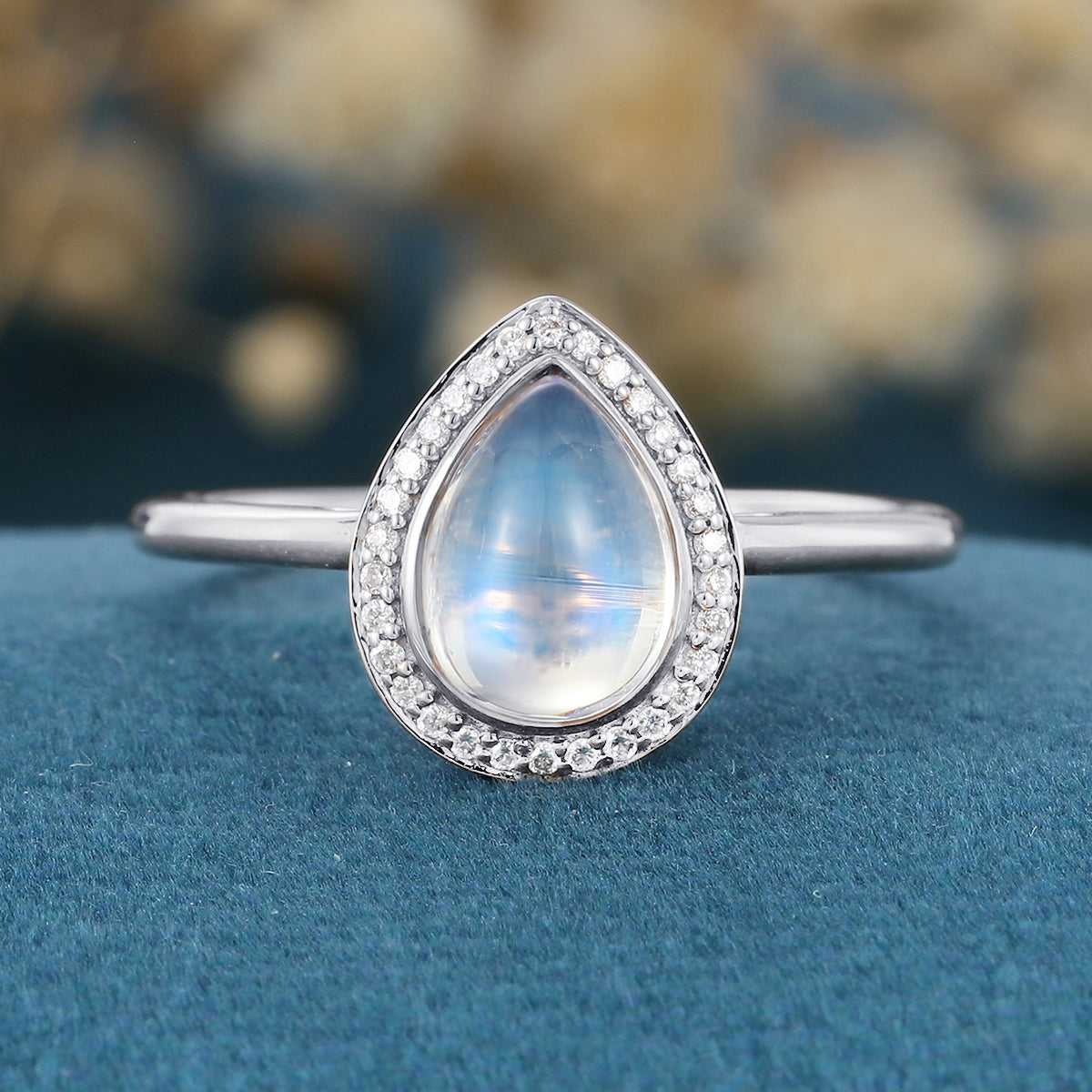 Type: Moonstone 1.2 Carat Size: 6 x 8 mm Shape: Pear cut Band Width: 1.6 mm | Band Thickness :1.2 mm Total weight: 2.3 g (Depending on the ring size) |