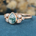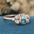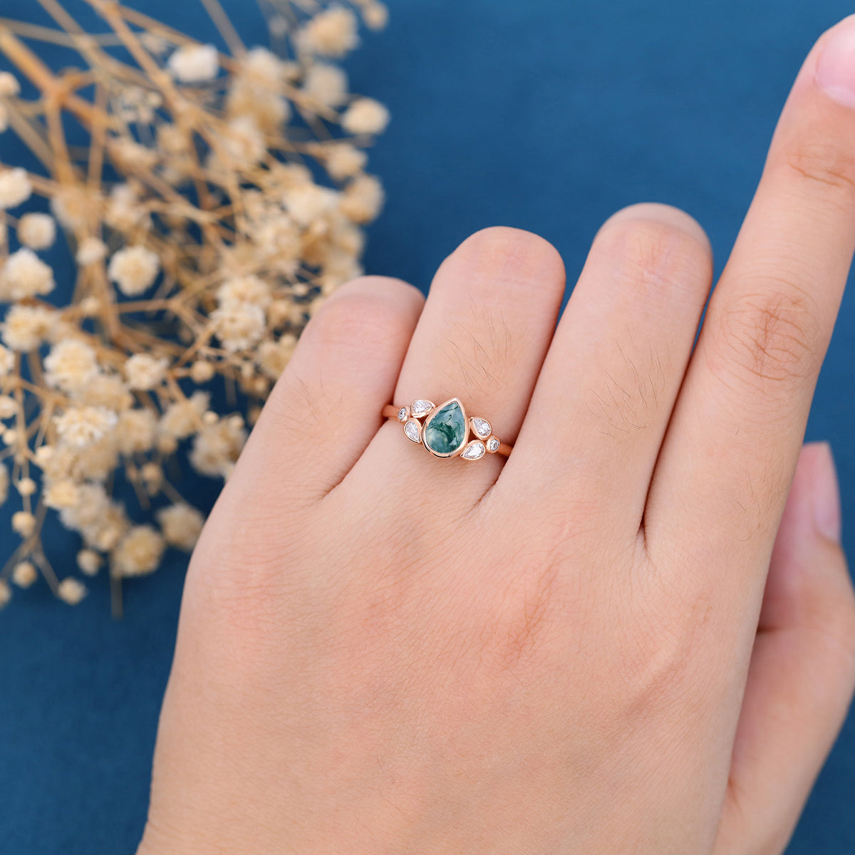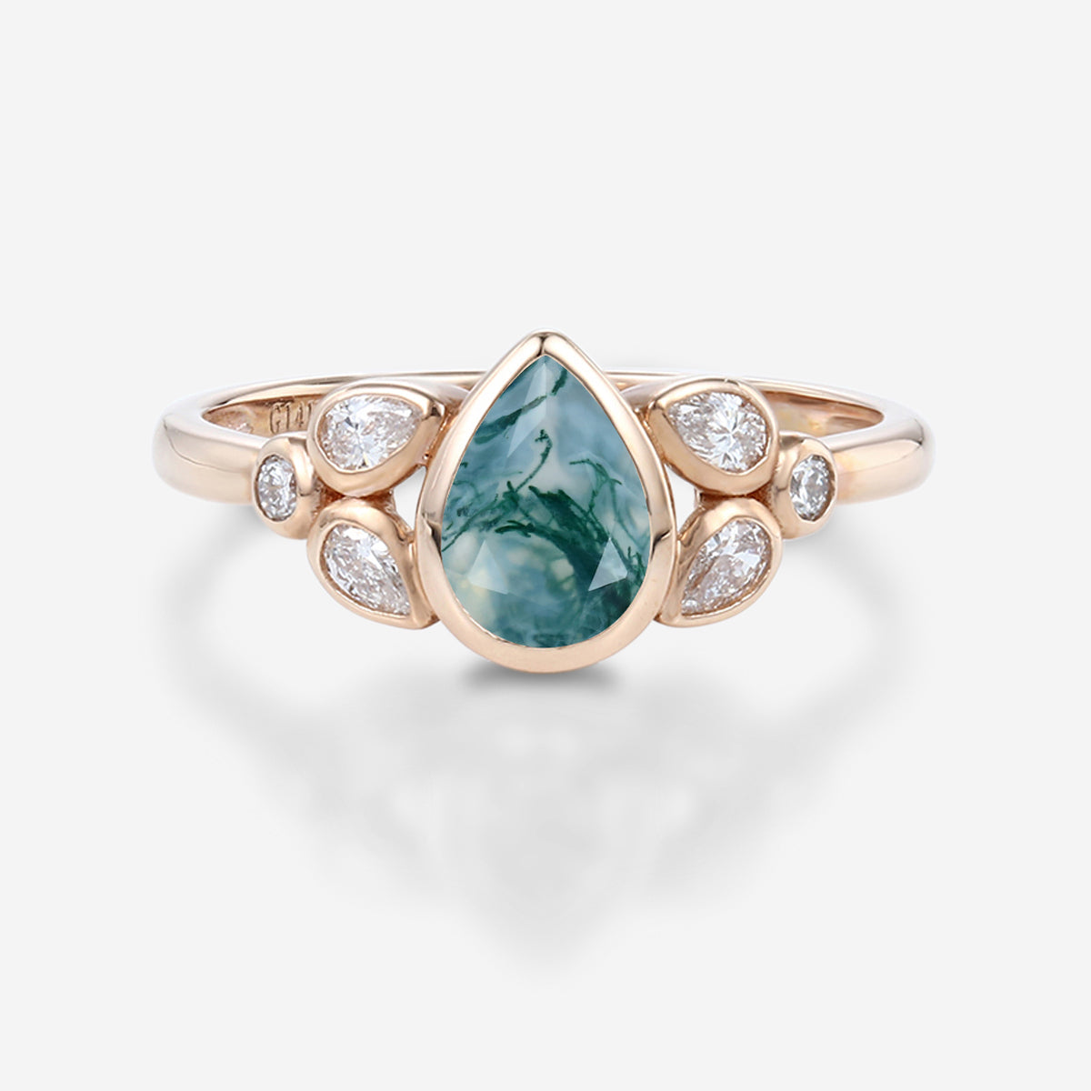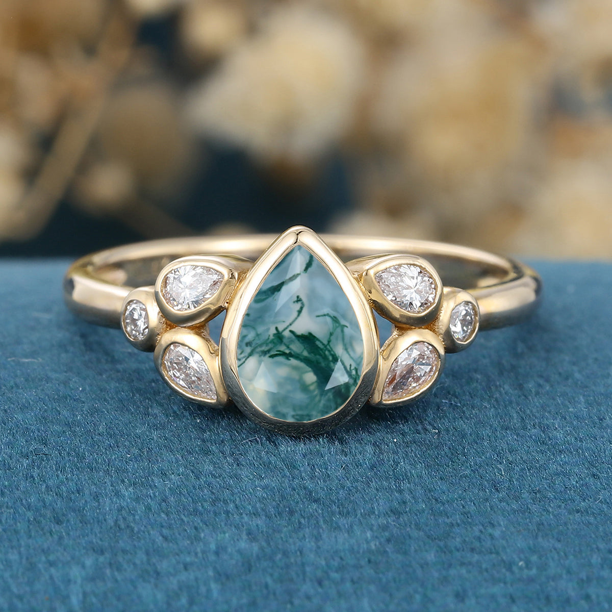 Bezel setting Pear cut Moss Agate Gold Engagement Ring