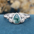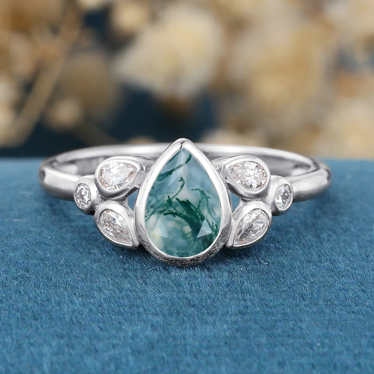 | Center Stone | Type: Moss Agate 1.2 Carat Size: 6 x 8 mm Shape: Pear cut Band Width: 1.8 mm | Band Thickness :1.2 mm Total weight: 2.2g (Depending on the ring size) |