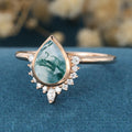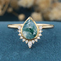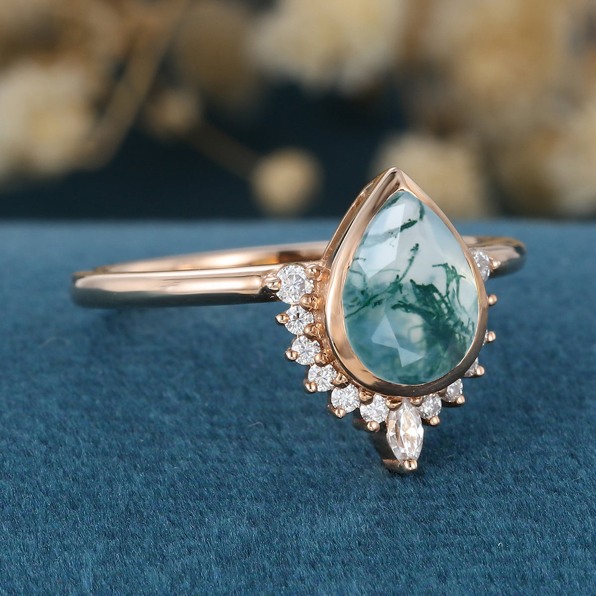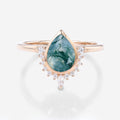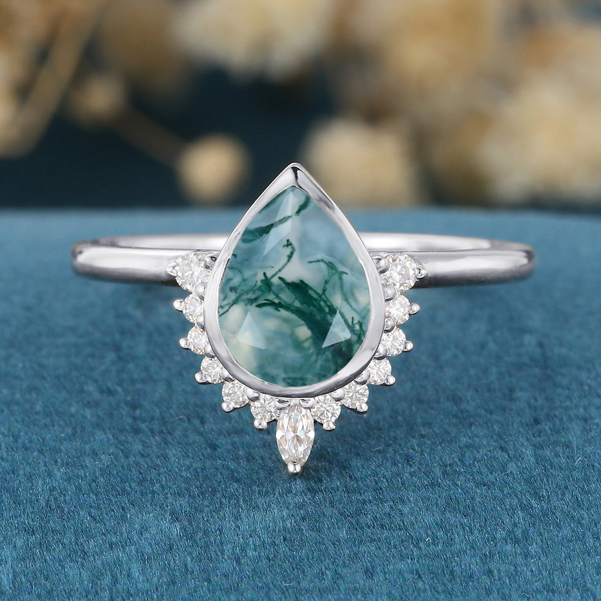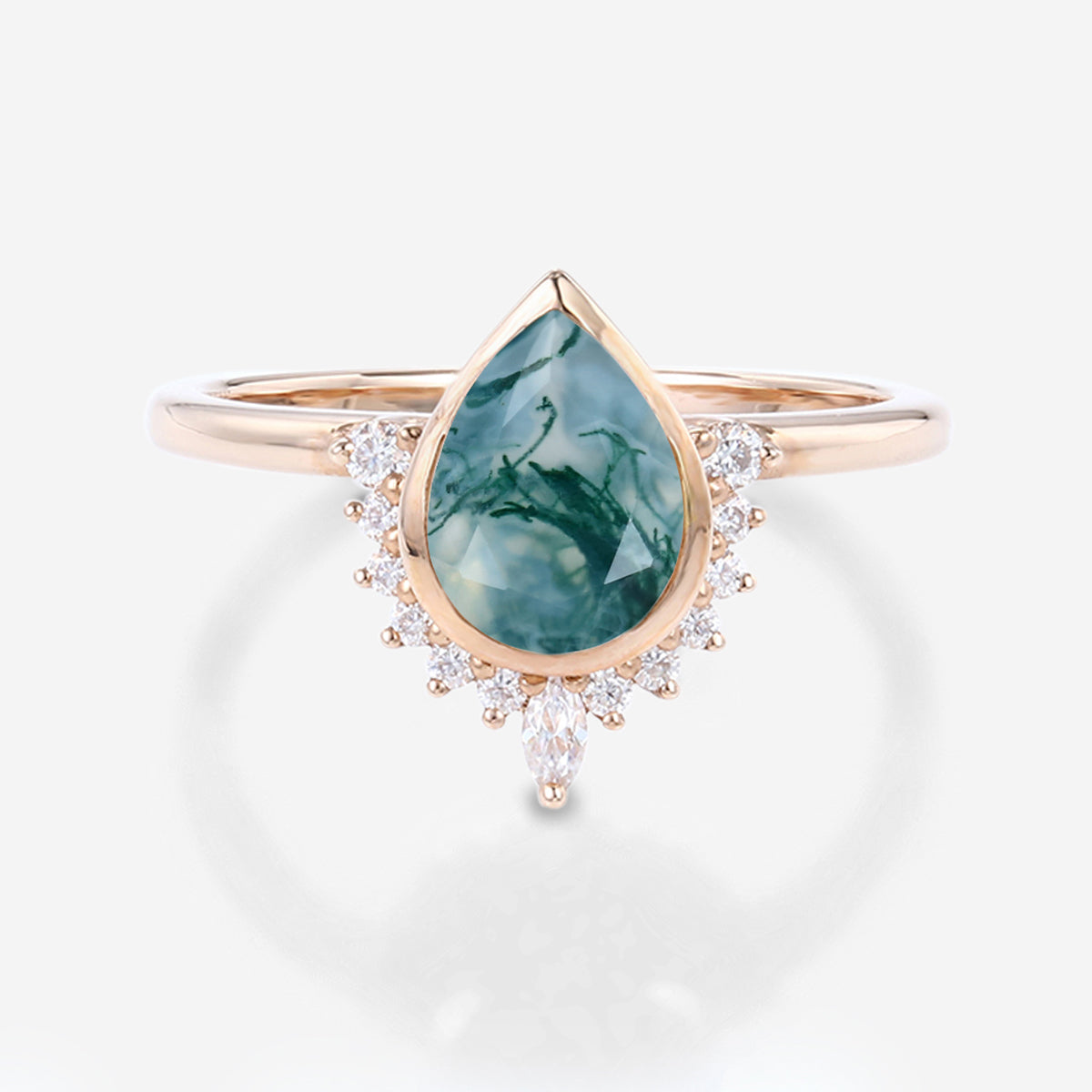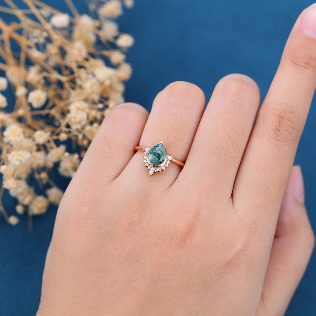 | Center Stone | Type: Moss Agate 1.2 Carat Size: 6 x 8 mm Shape: Pear cut Band Width: 1.6 mm | Band Thickness :1.1 mm Total weight: 2.5 g (Depending on the ring size) |