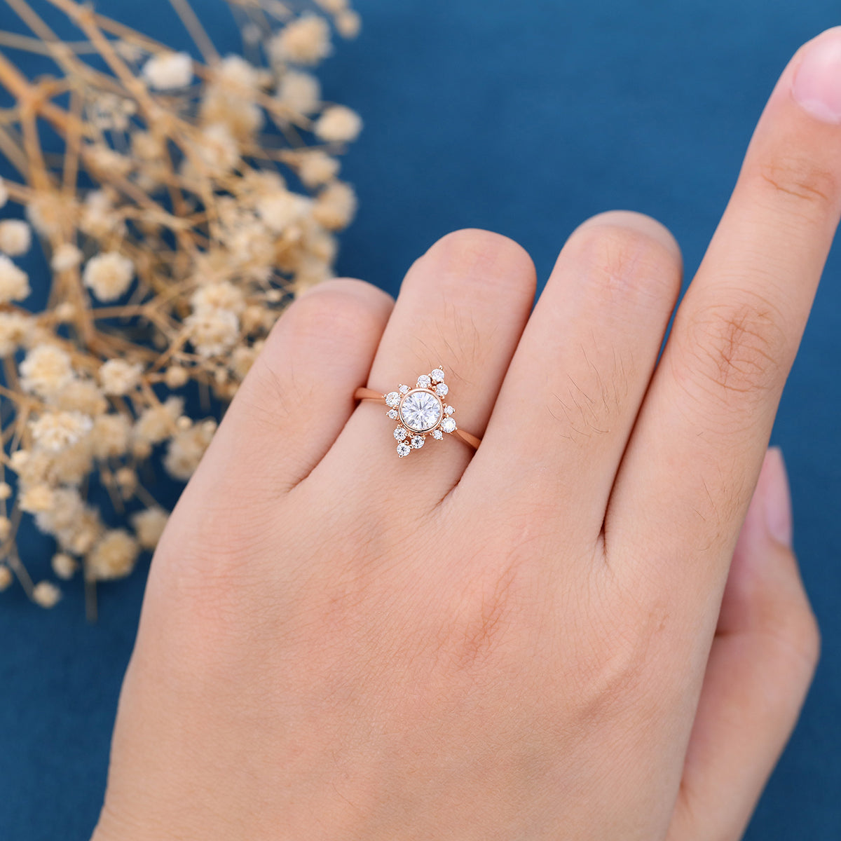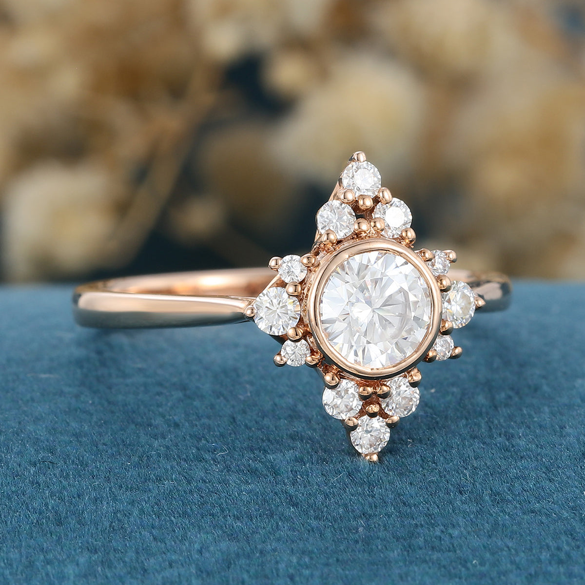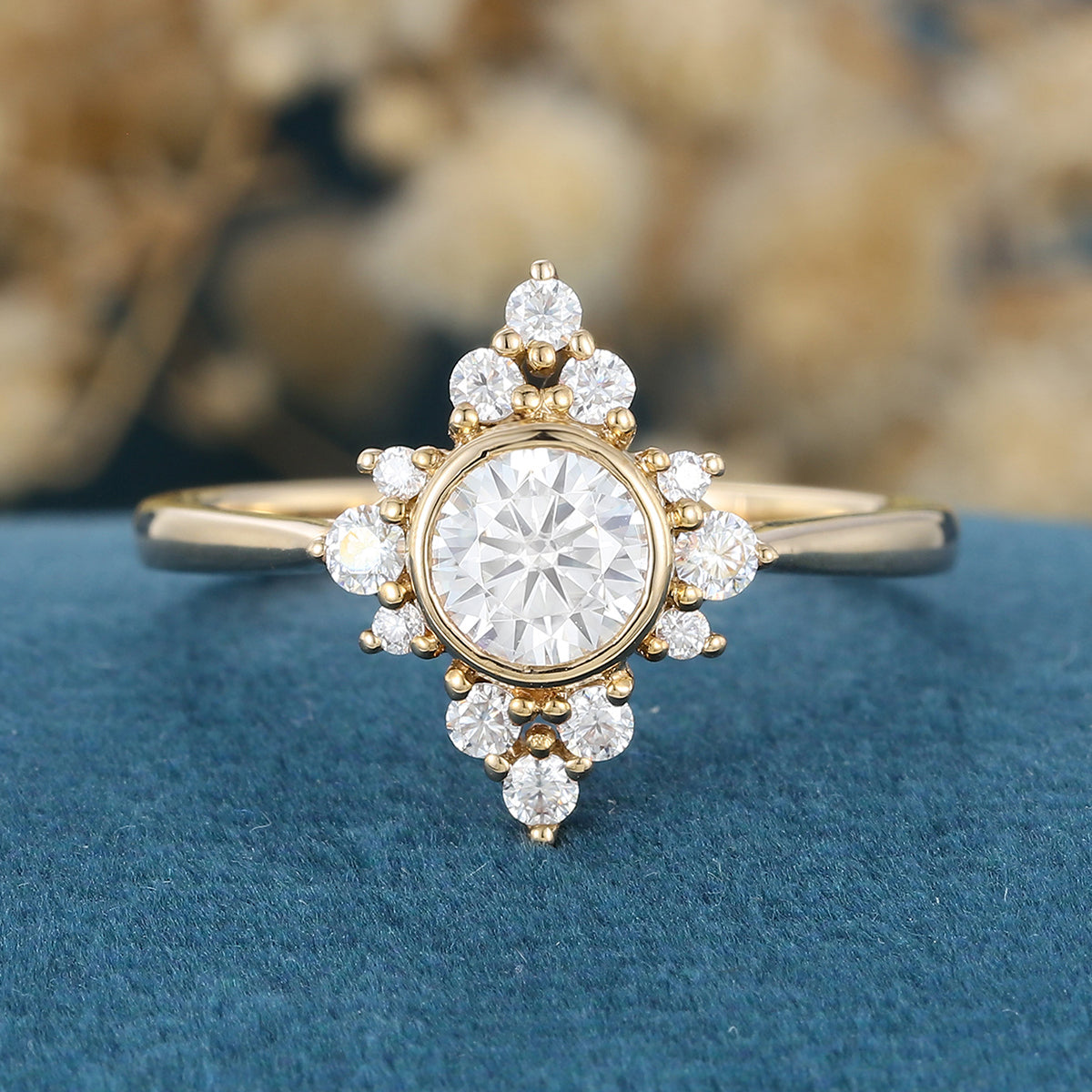 Bezel setting Round cut Moissantie Halo inlaid Gold Engagement Ring
