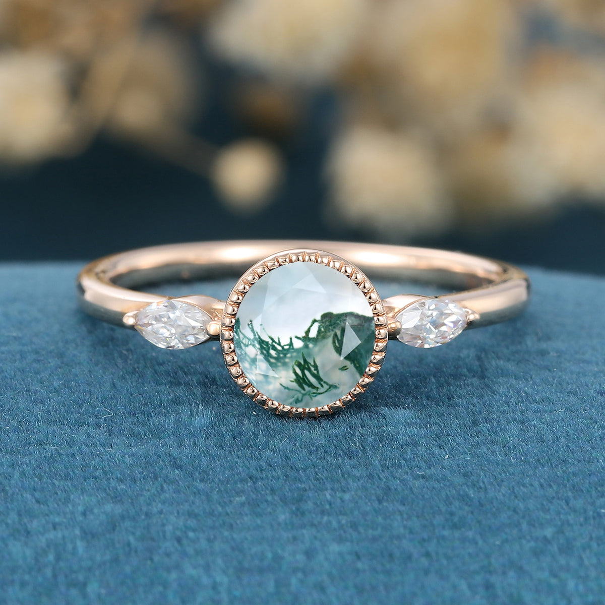 Type: Moss Agate 1.0 Carat Size: 6.0 mm Shaped: Round cut The band Width: 1.58 mm | Thickness :1.2 mm Total weight: 2.2 g(Depending on the ring size) |