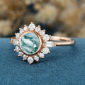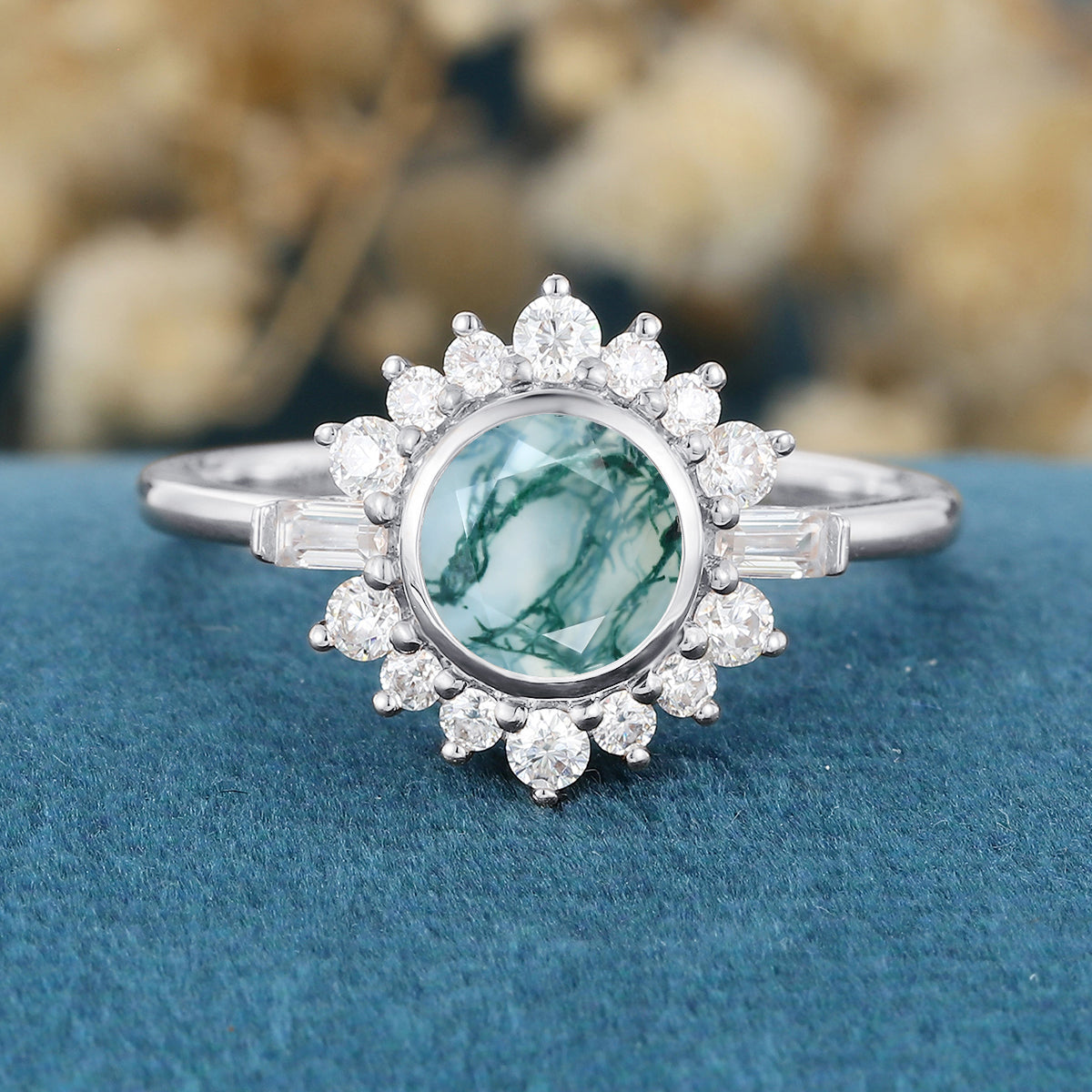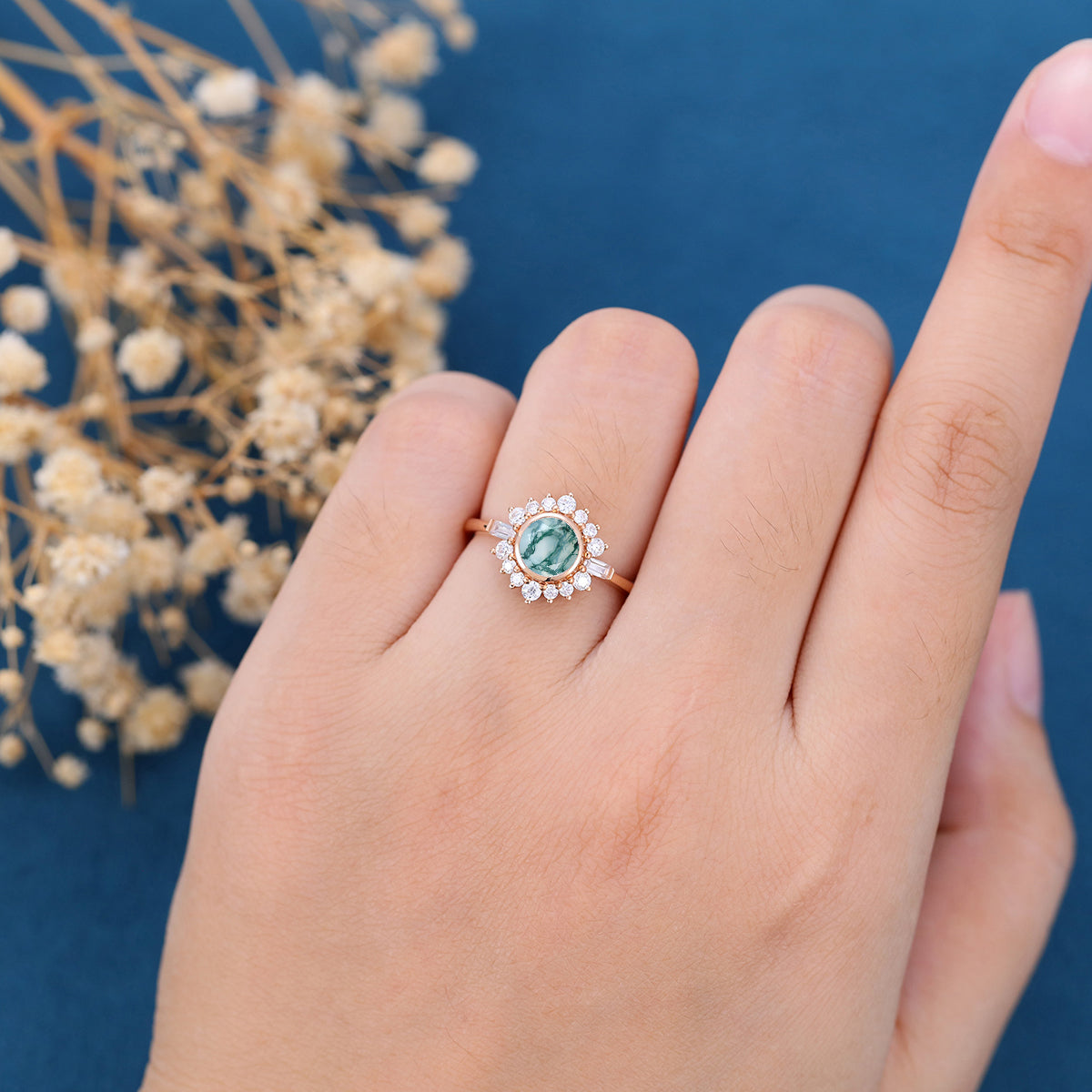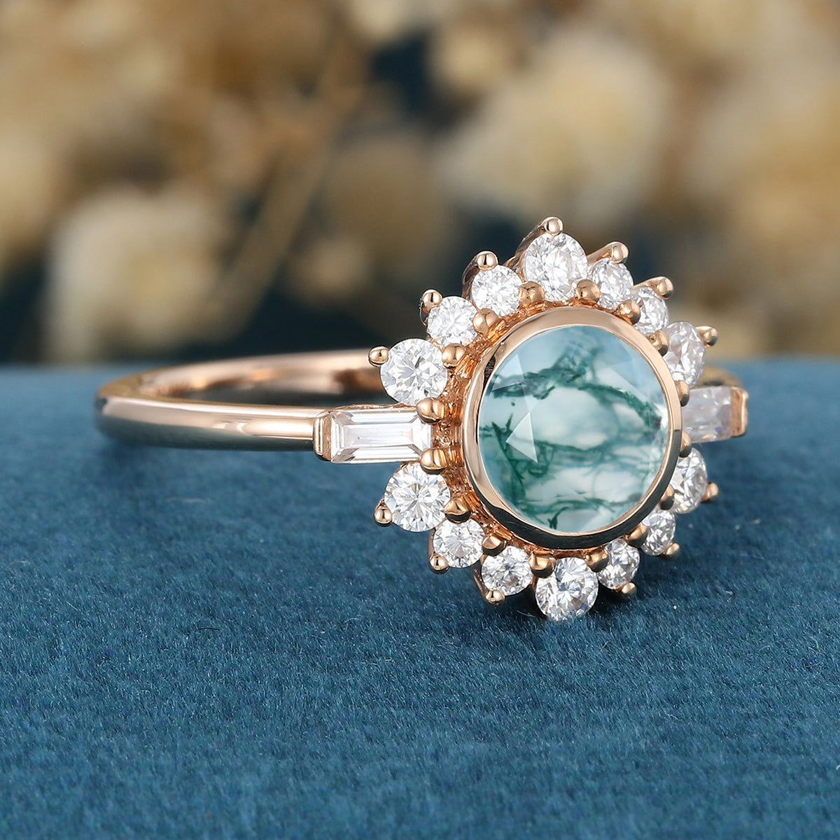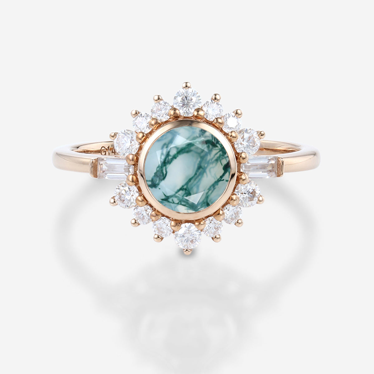 Bezel setting Round cut Moss Agate Halo Gold Engagement Ring