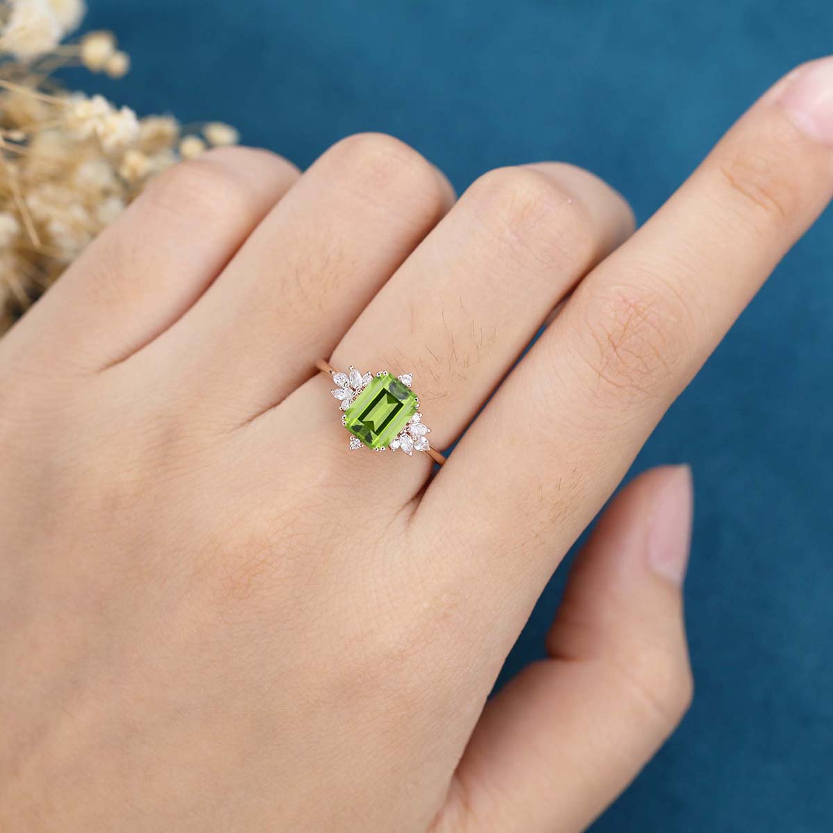 Emerald cut Olivine Cluster Engagement Ring