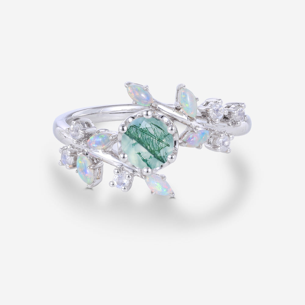 Round Cut Natural Green Moss Agate Cluster Engagement Ring