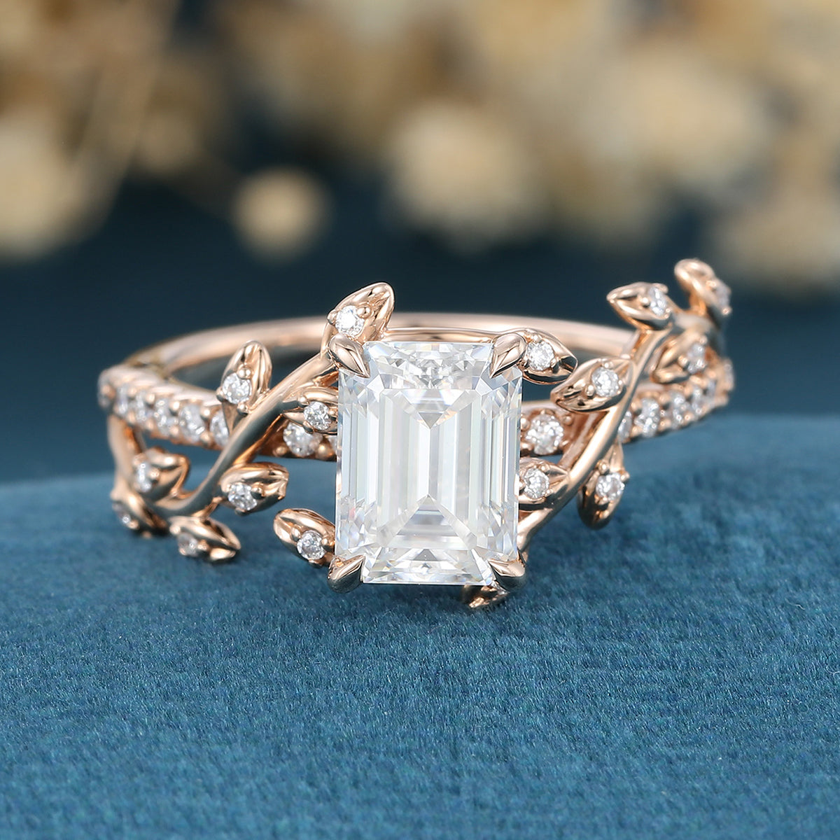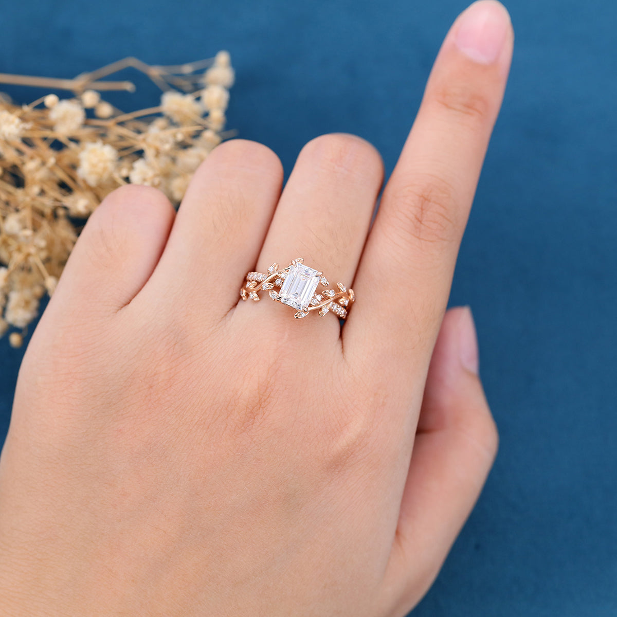 Nature Inspired Emerald cut Moissanite Leaf Gold Engagement Ring
