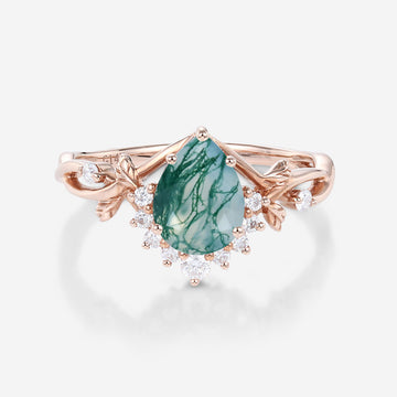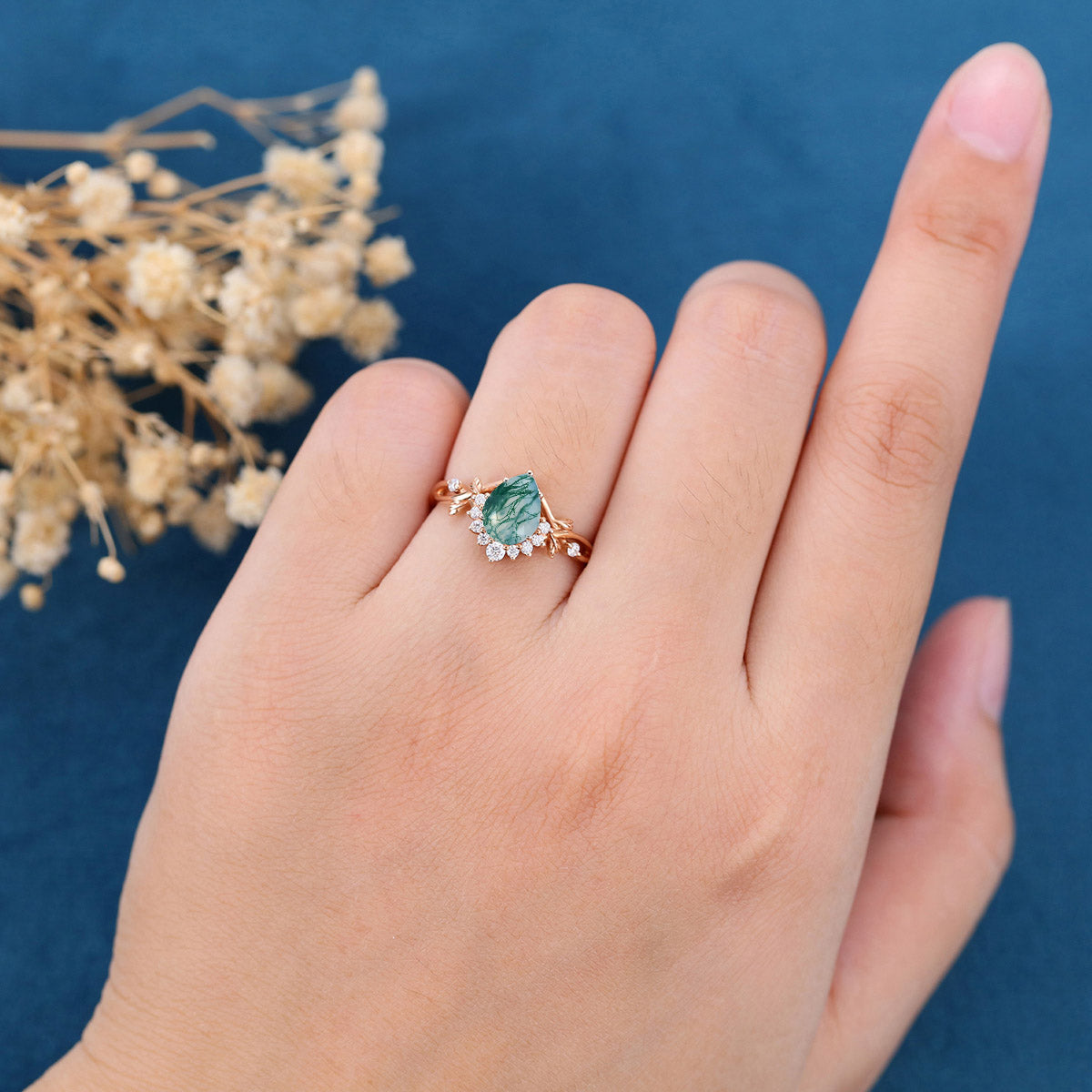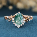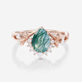 Nature Inspired Pear cut Moss Agate Leaf Gold Engagement Ring