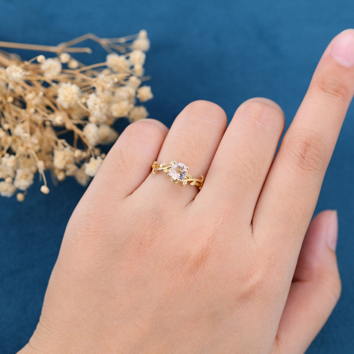 Nature Inspired Round cut Morganite Leaf Gold Engagement Ring