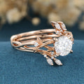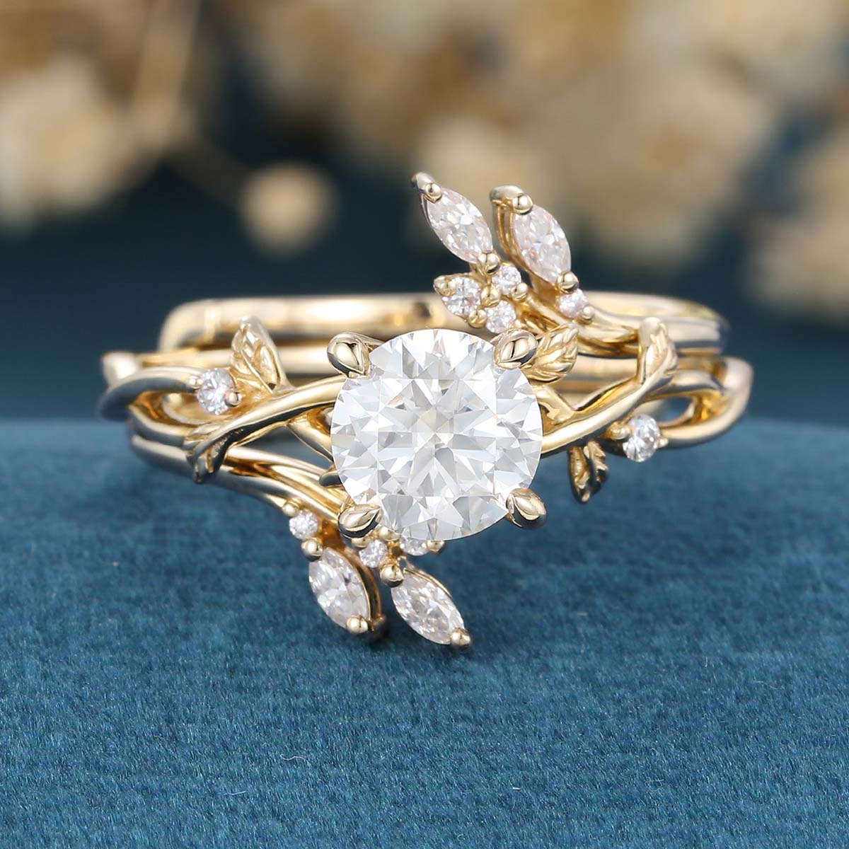 Nature Inspired Round cut Moissanite Leaf Gold ring set