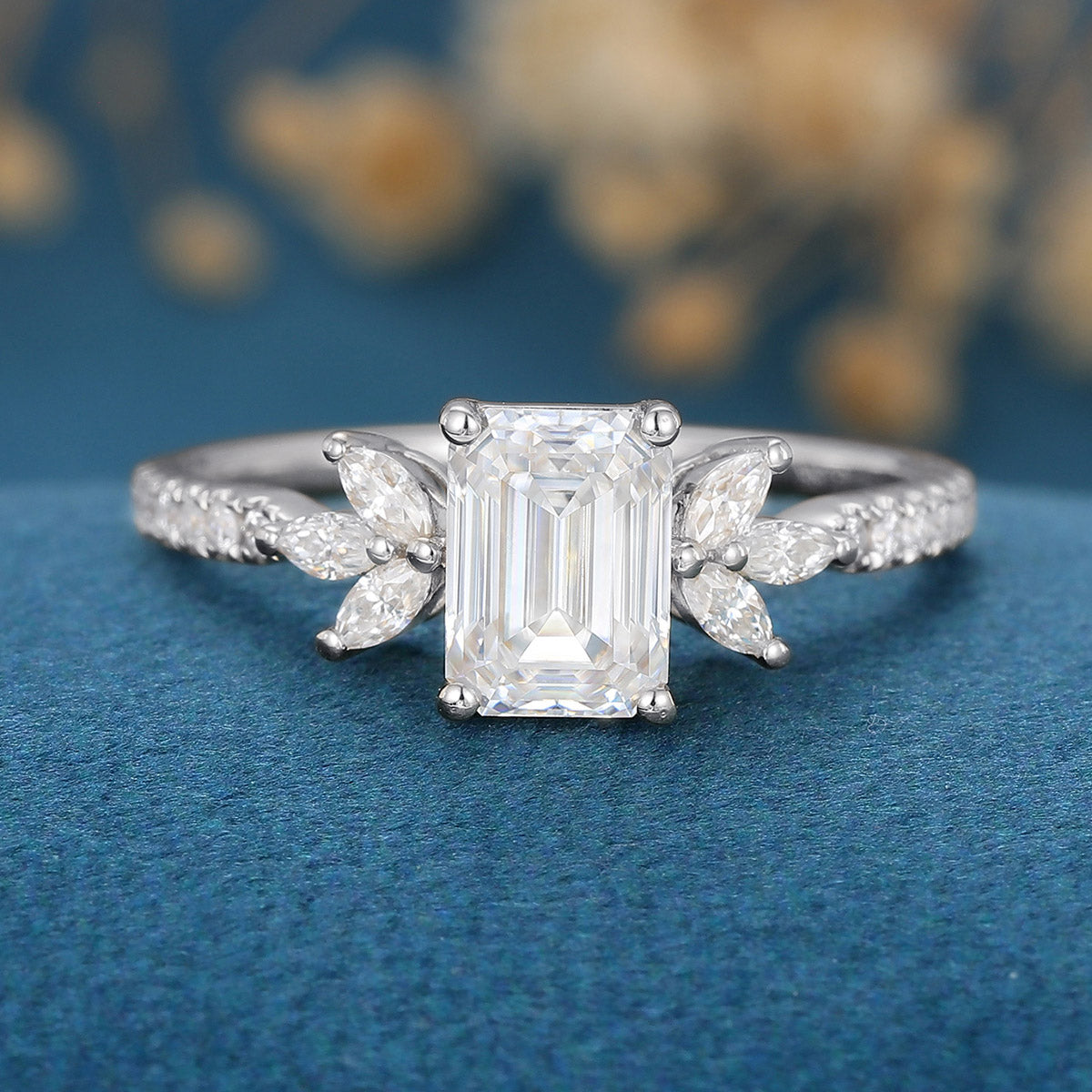 1 Carat Emerald cut Moissanite Cluster Engagement ring
