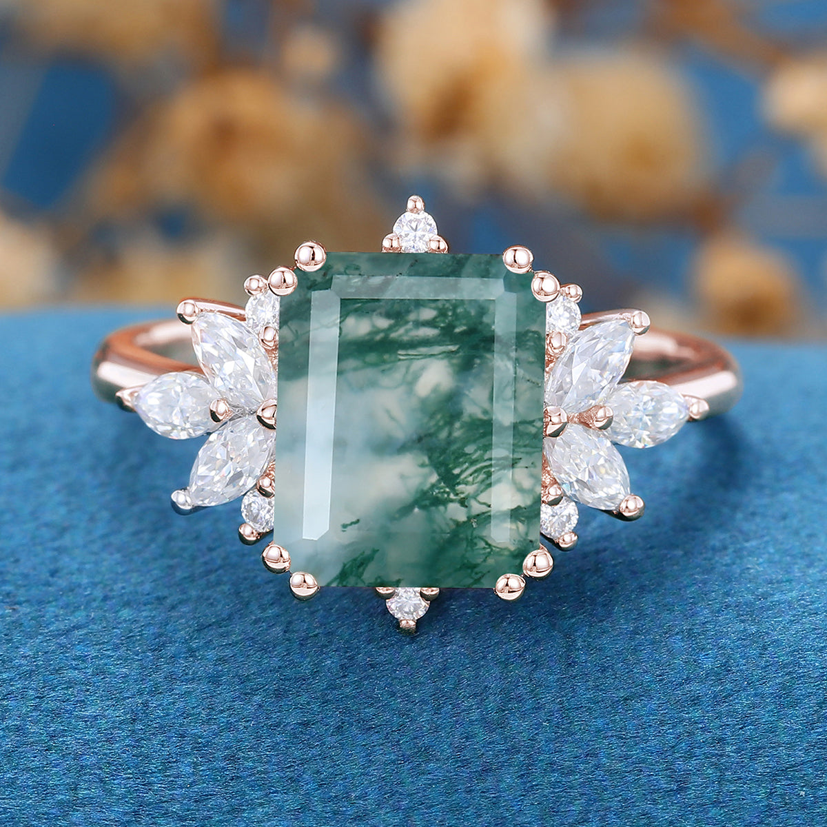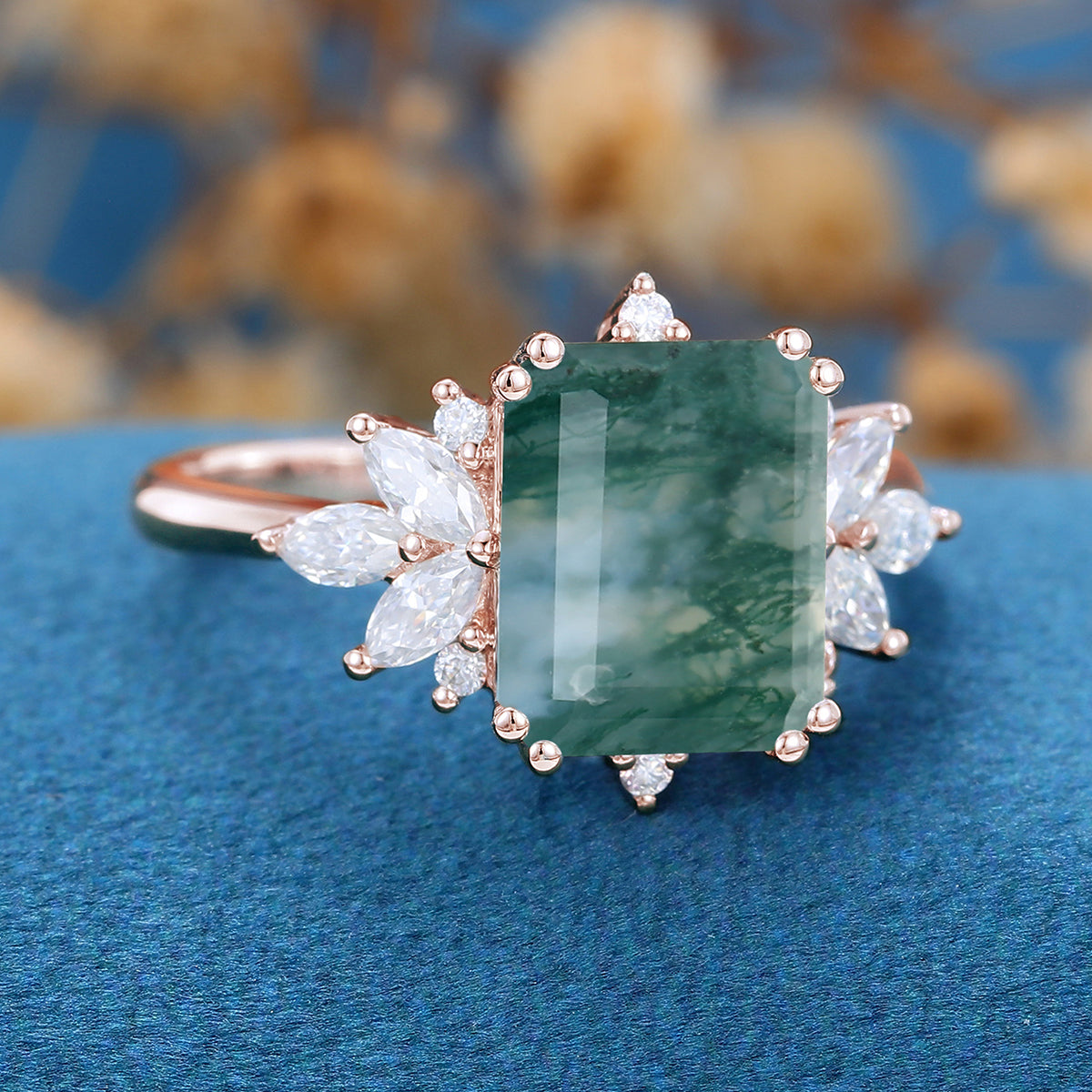 Emerald Cut Natural Green Moss Agate Cluster Engagement Ring