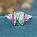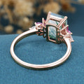Emerald Cut Natural Green Moss Agate Cluster Engagement Ring