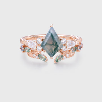 1.6Carat Kite Cut Natural Green Moss Agate Cluster Engagement Ring Set