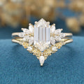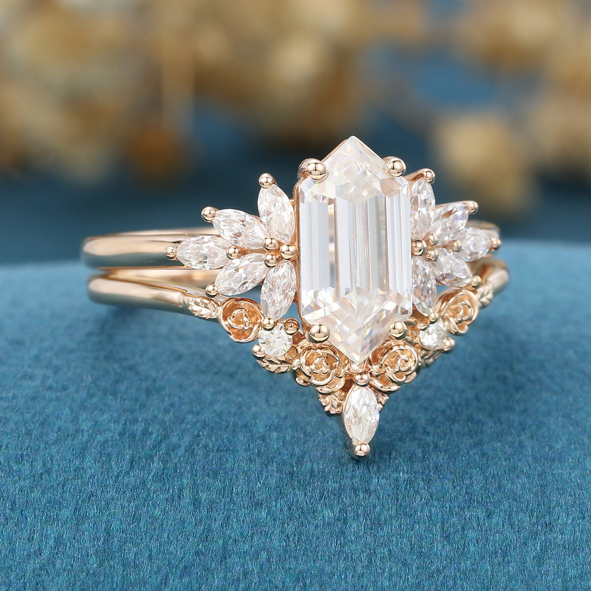Hexagon cut Moissanite Engagement Ring Cluster diamonds Rose Gold Wedding Bridal Set