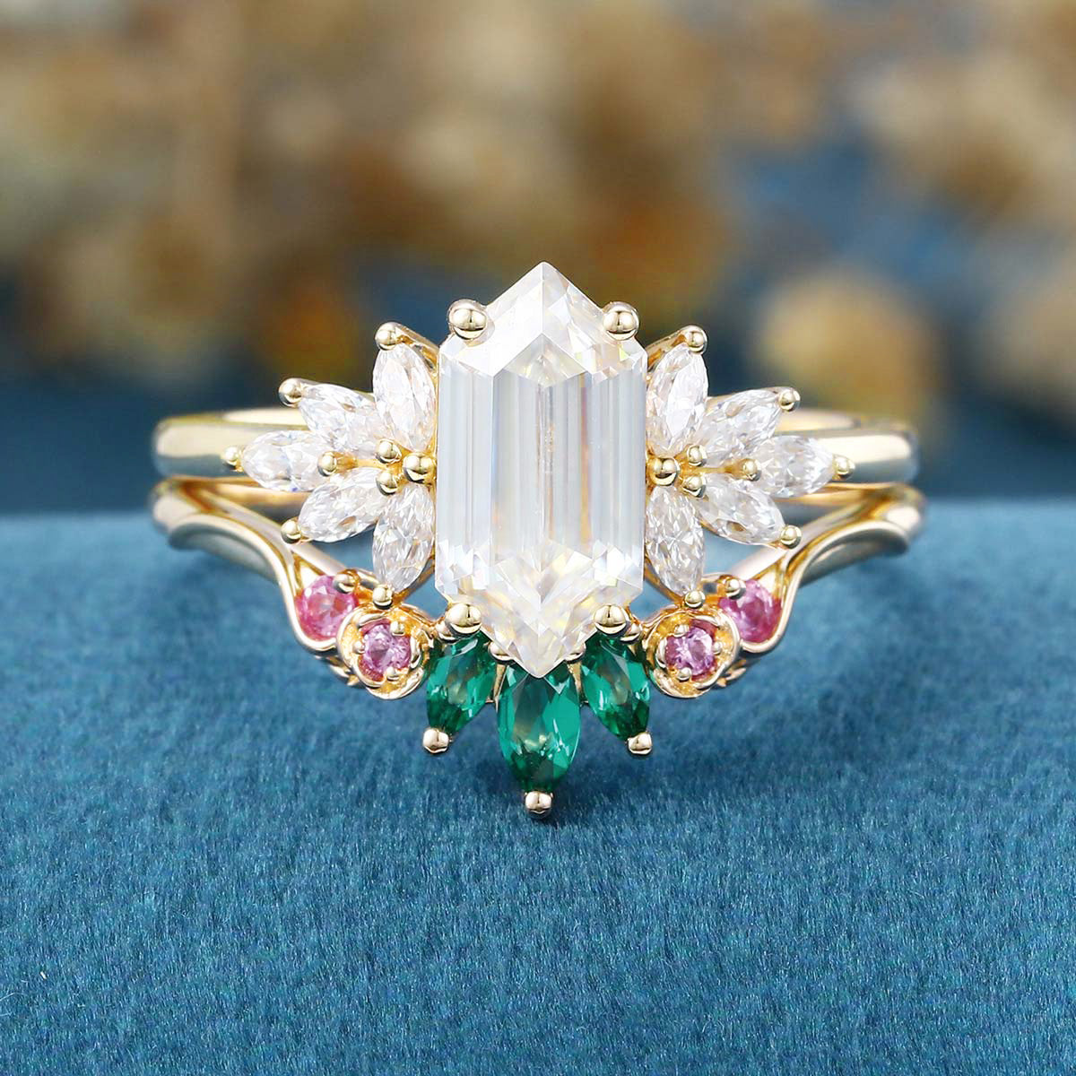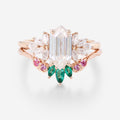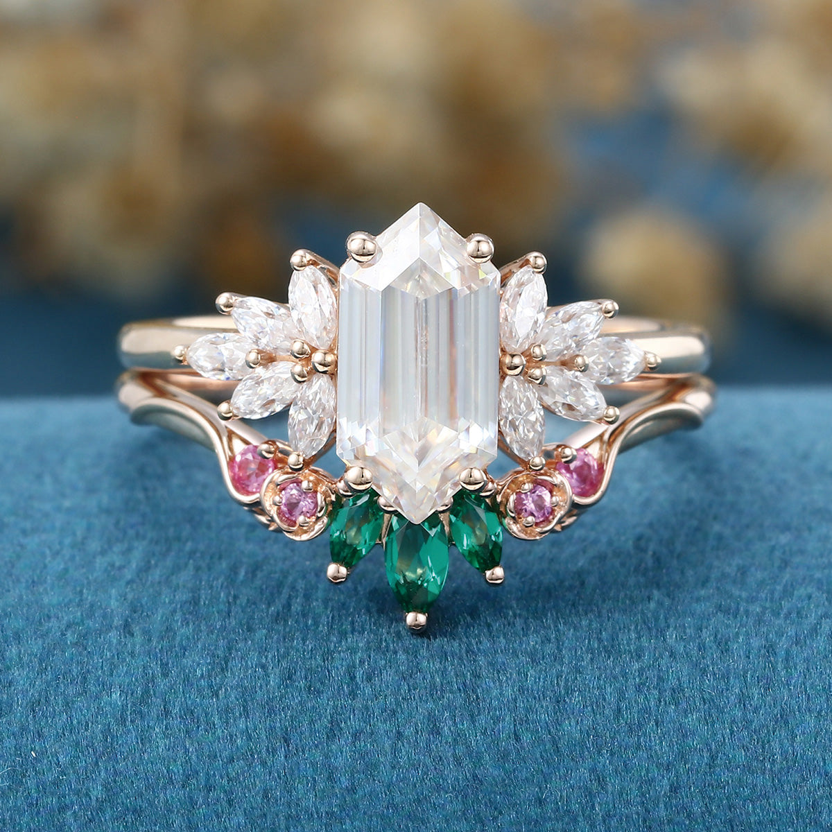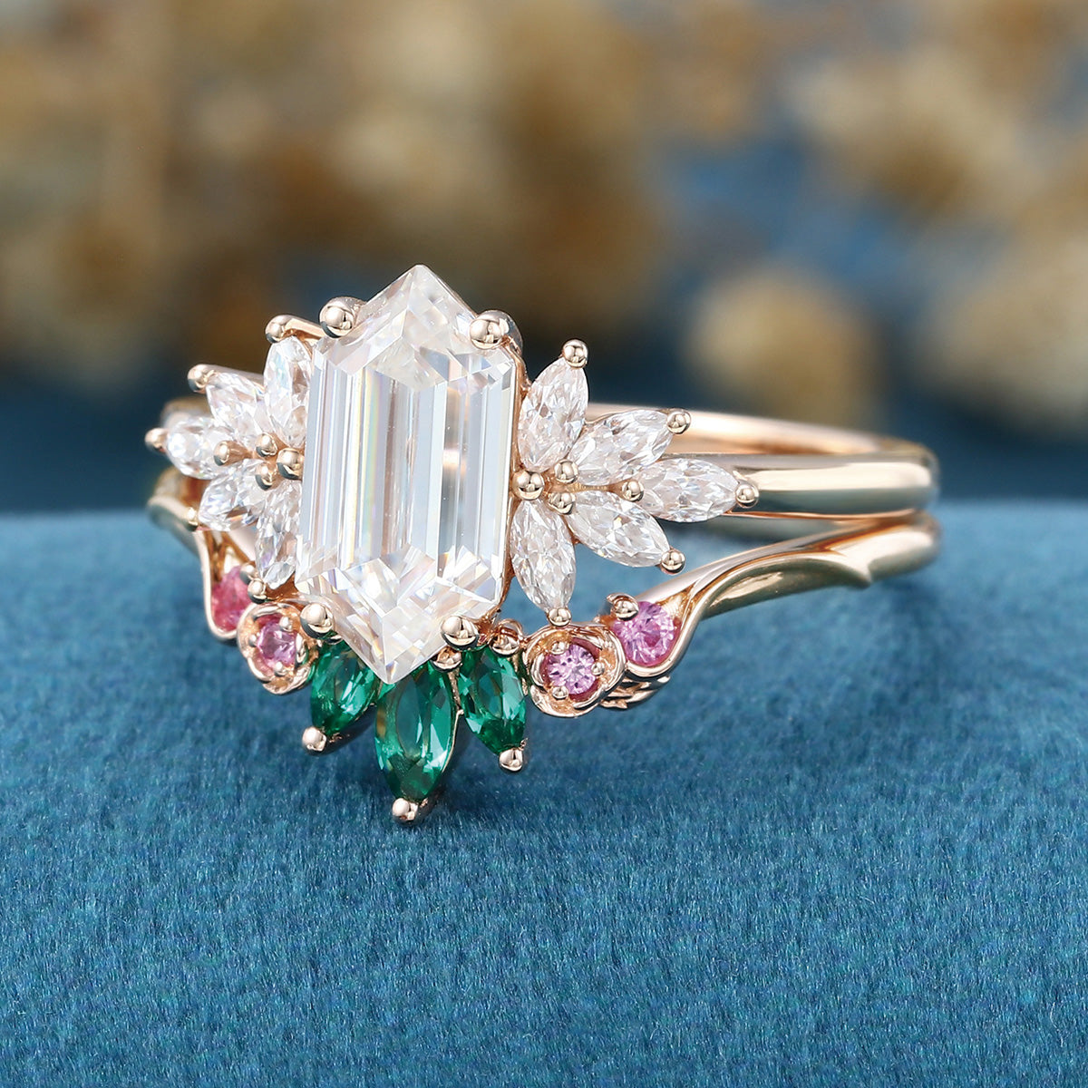 Hexagon cut Moissanite Matching Diamonds | Lab Grown Emerald | Natural Pink Sapphires Rose Gold Wedding Bridal Set