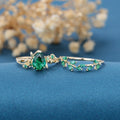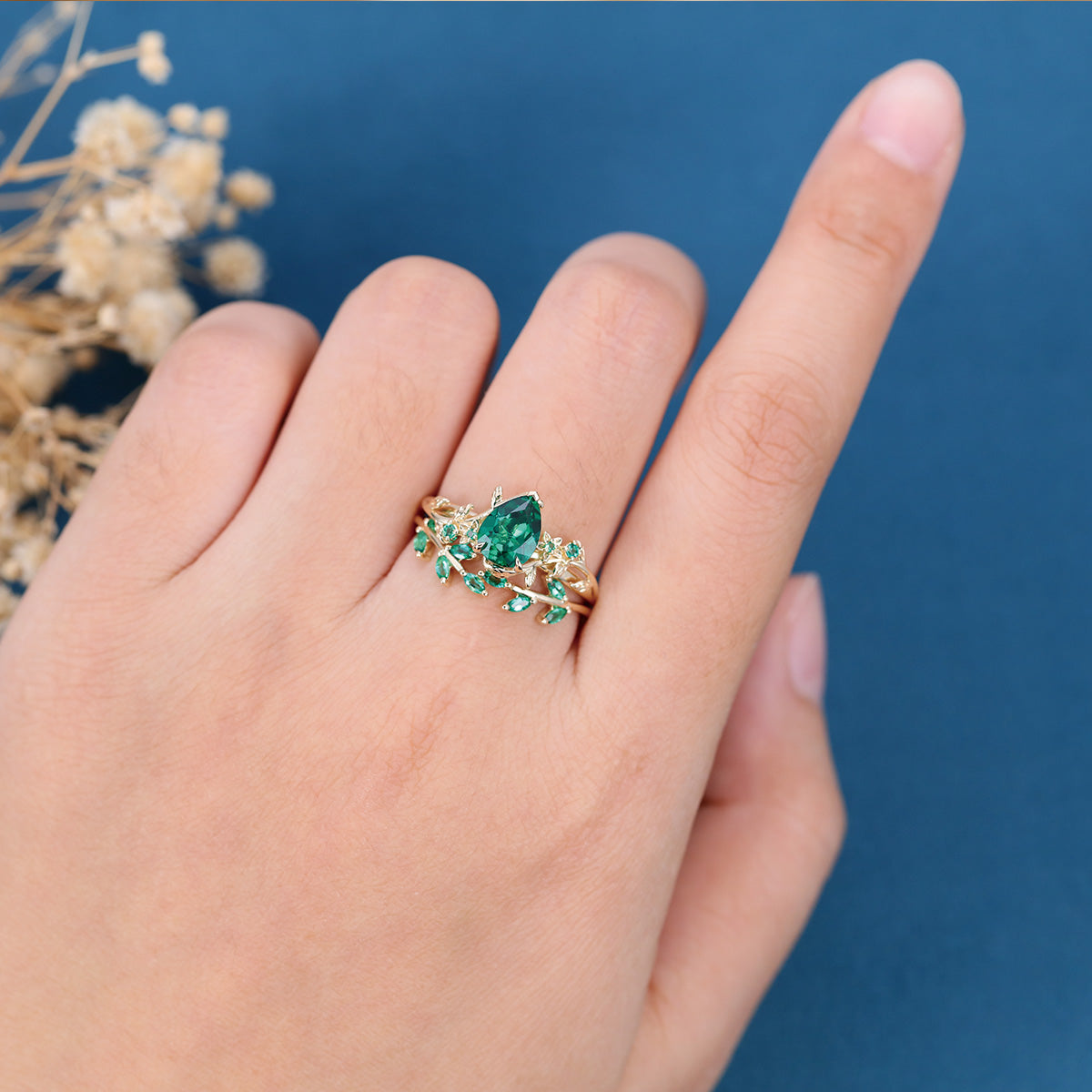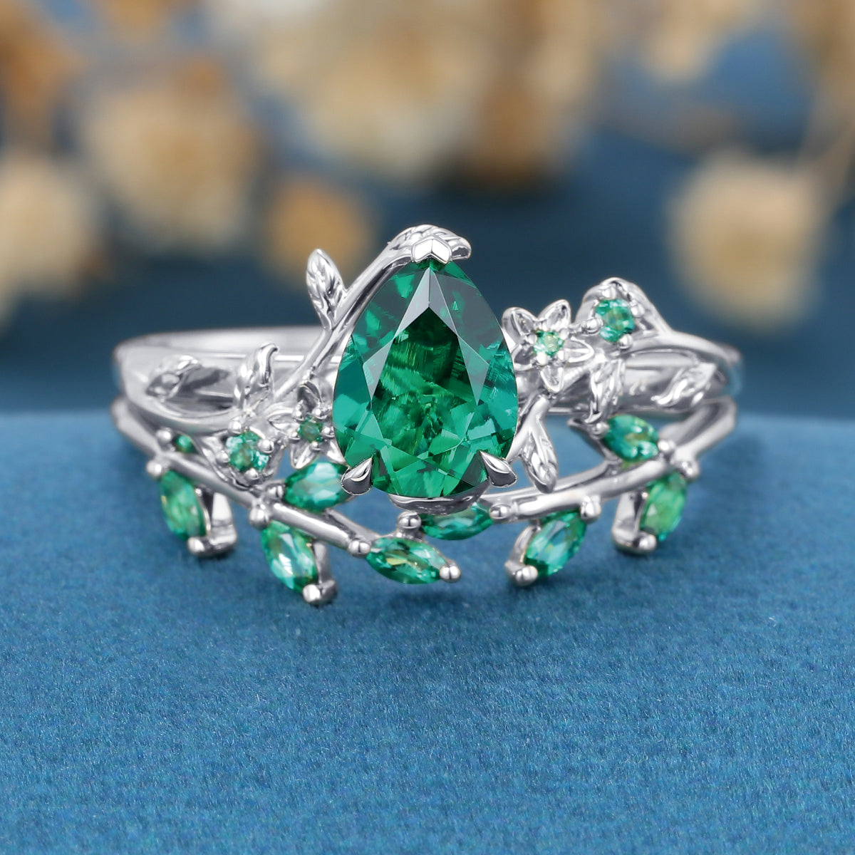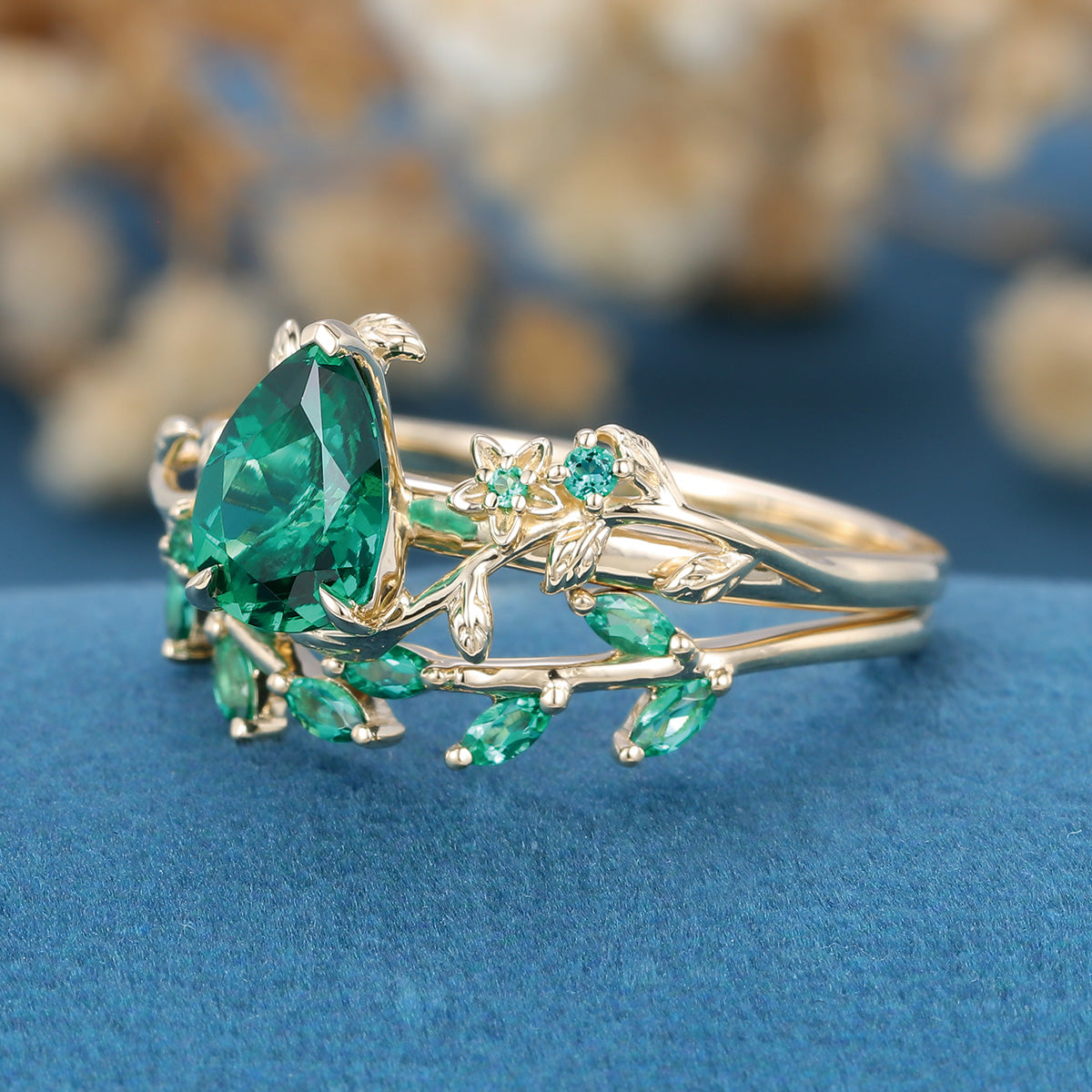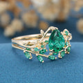 Inspired Pear cut Emerald Solid Gold Wedding Bridal Set
