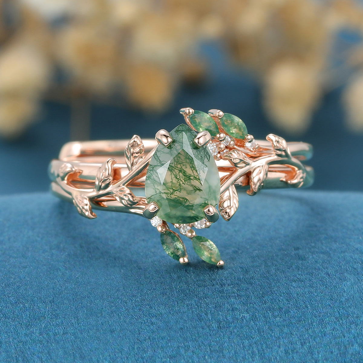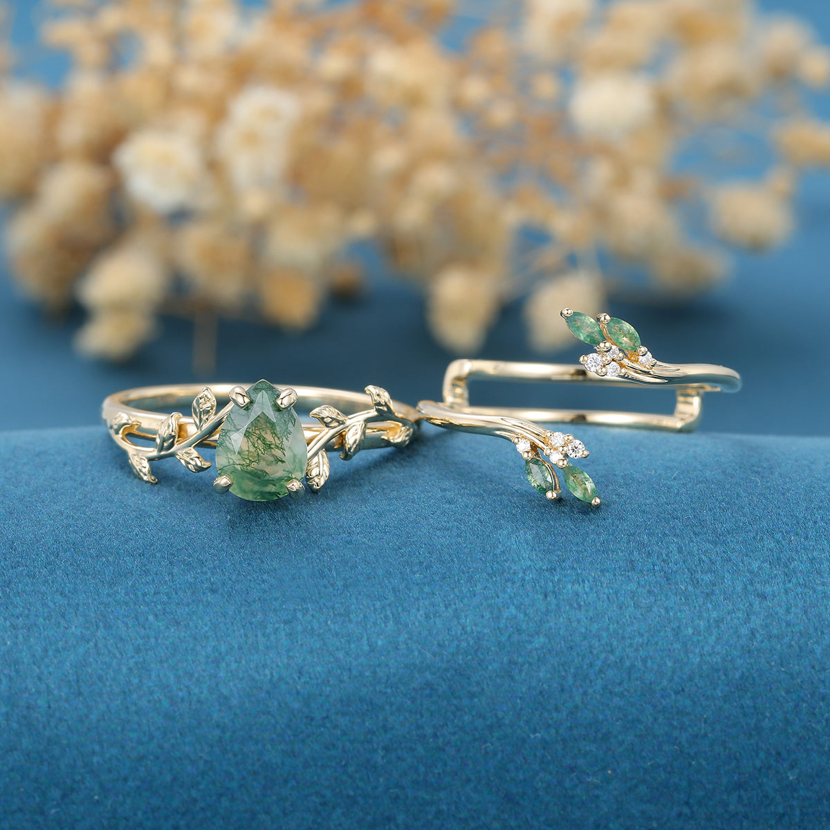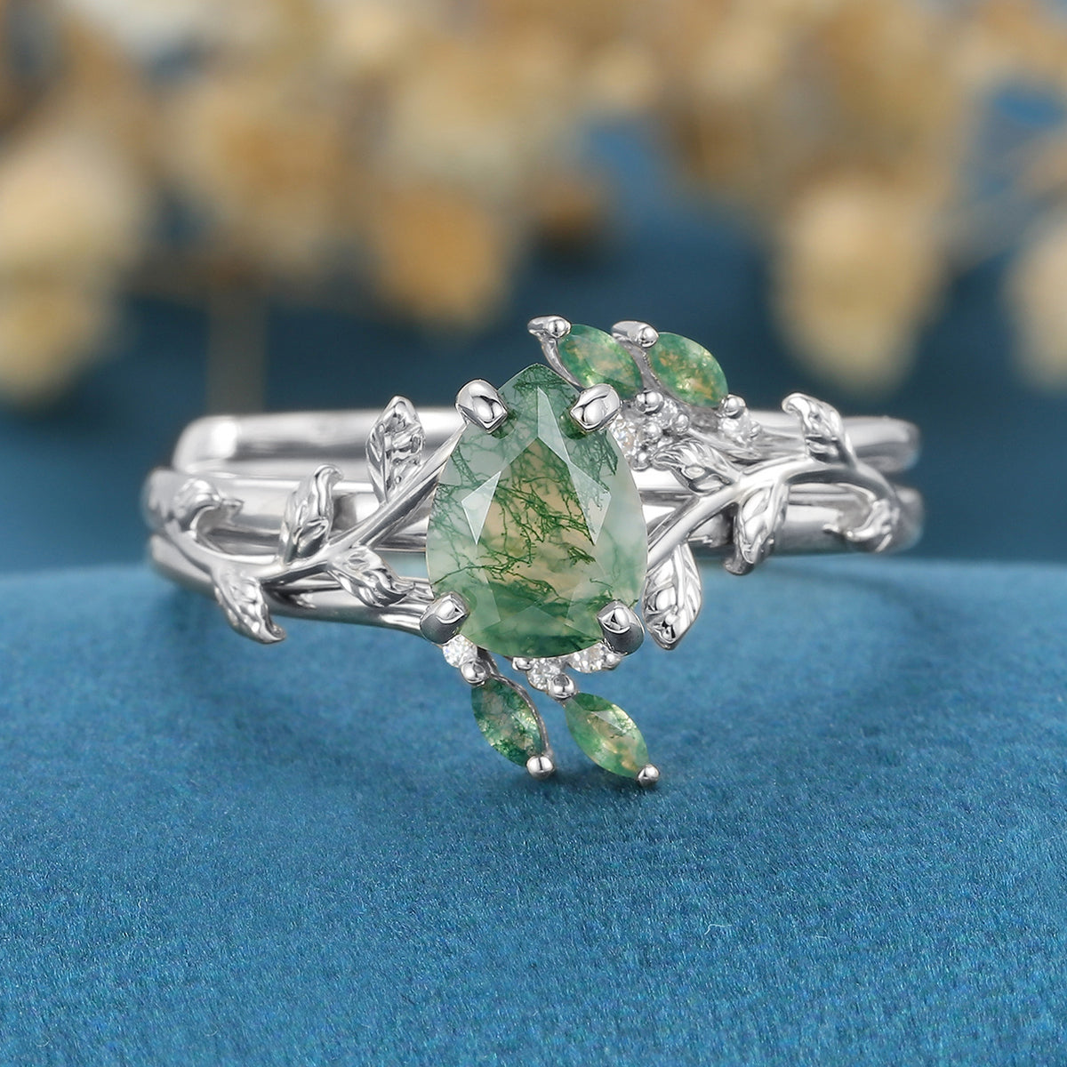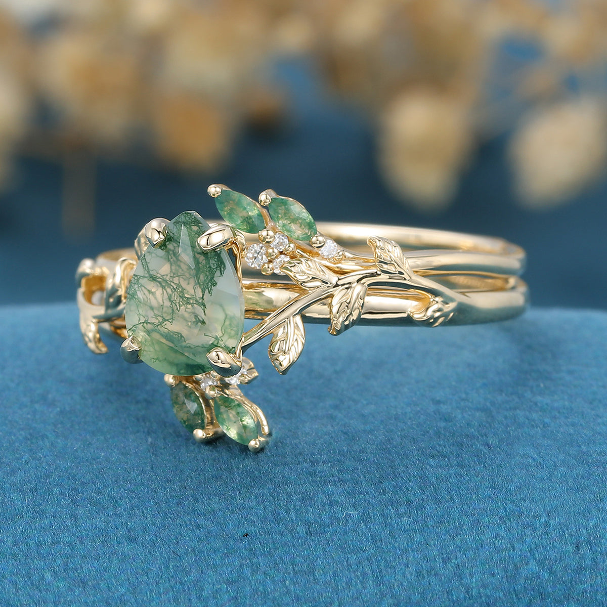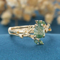 Inspired Pear cut Moss Agate Solid Gold Wedding Bridal Set
