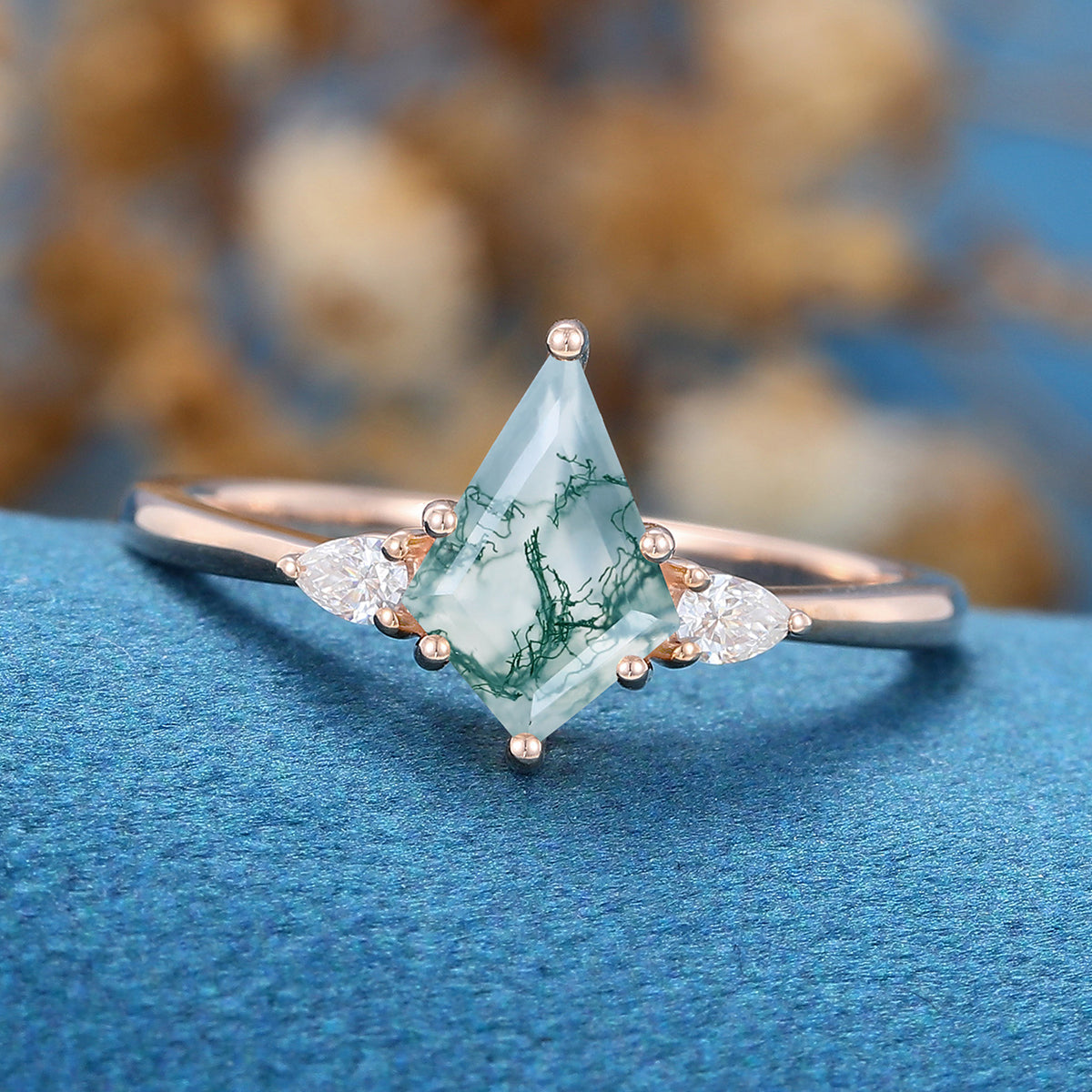 Kite Cut Natural Green Moss Agate Cluster Engagement Ring