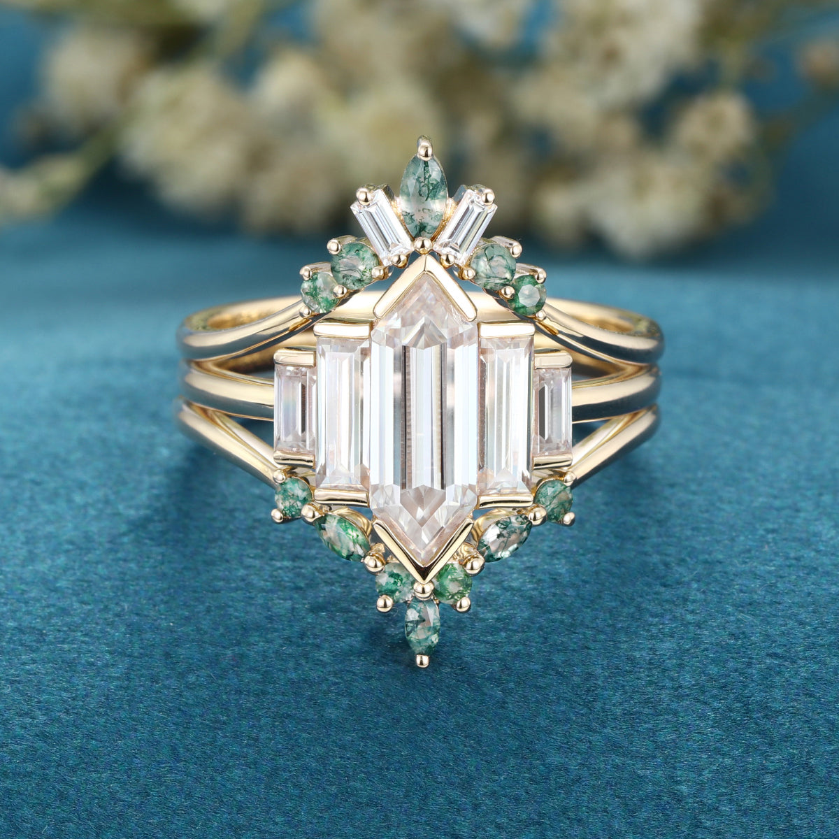 Long Hexagon cut Moissanite Bezel Engagement Ring Matching Curved Moss Agate band set