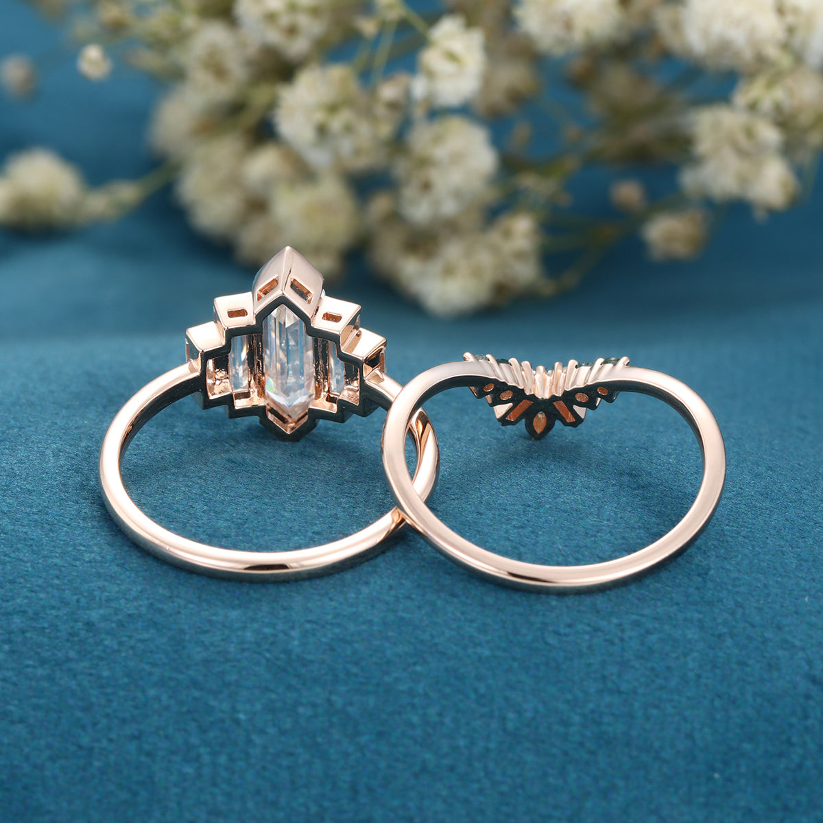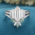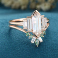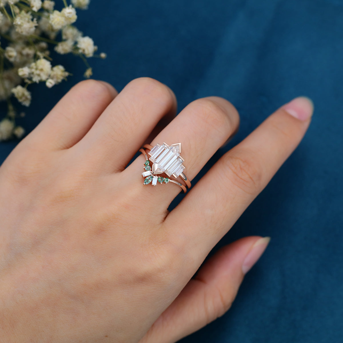 Long Hexagon cut Moissanite Bezel Engagement Ring Matching Curved Moss Agate band set