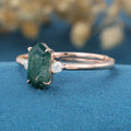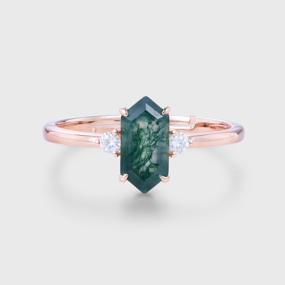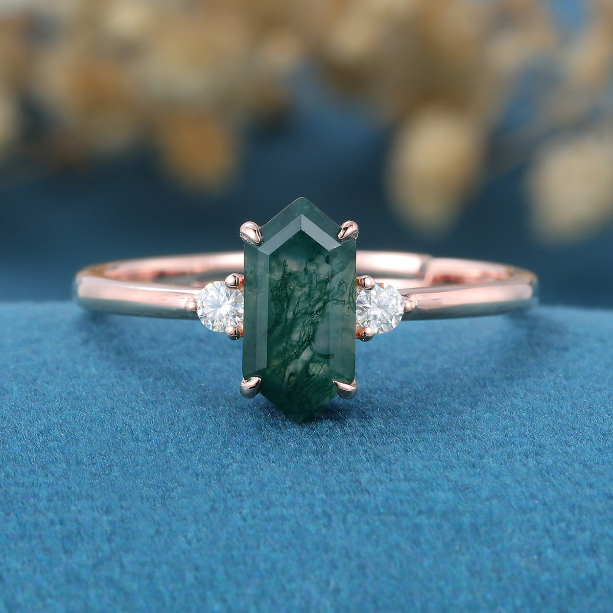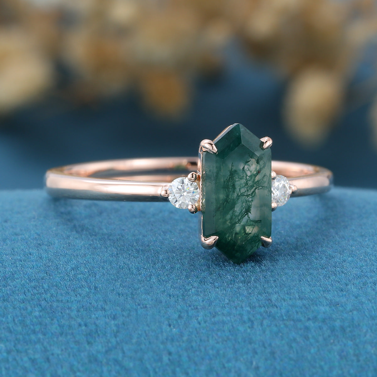 Long Hexagon cut Moss Agate Matching Moissanite | Diamonds Engagement ring