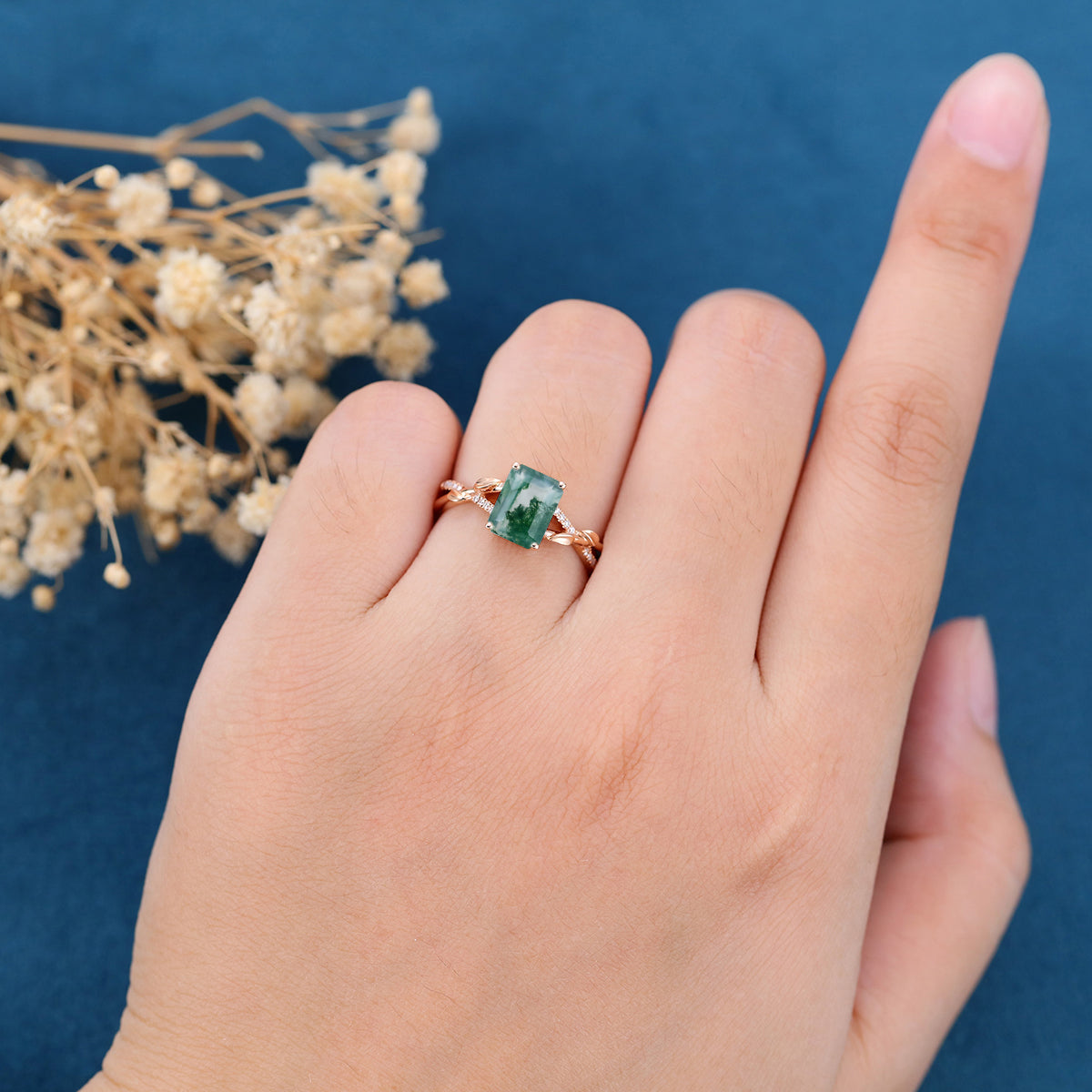 Type: Moss Agate 1.7 Carat Size: 6 x 8 mm Shape: Emerald cut Total weight: 2.6g (Depending on the ring size) |