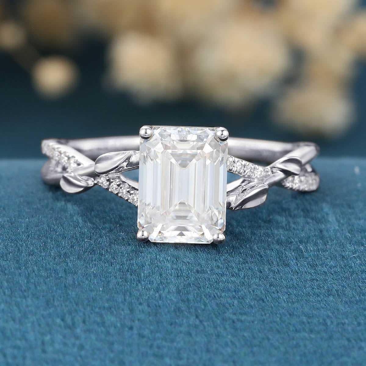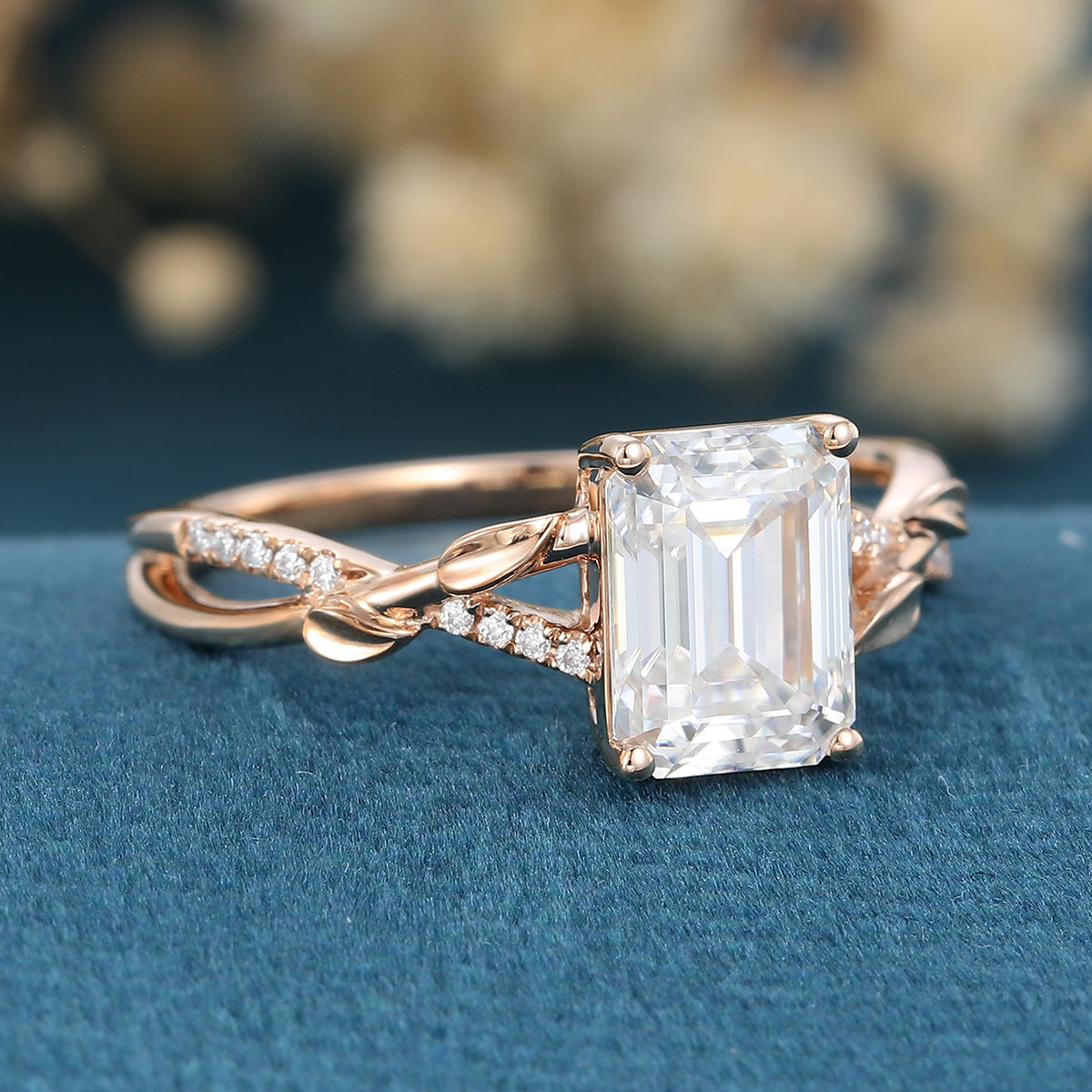 Nature Inspired Emerald cut Moissanite Leaf Gold Engagement Ring