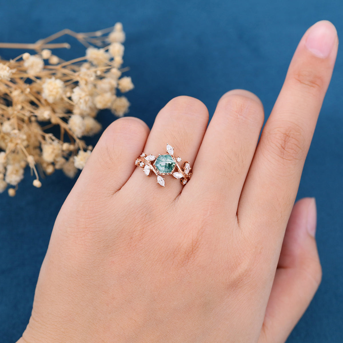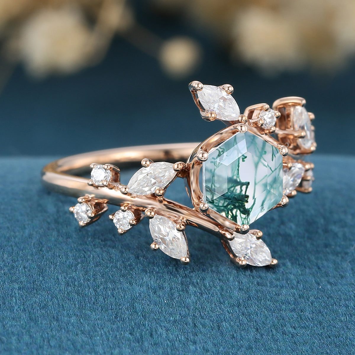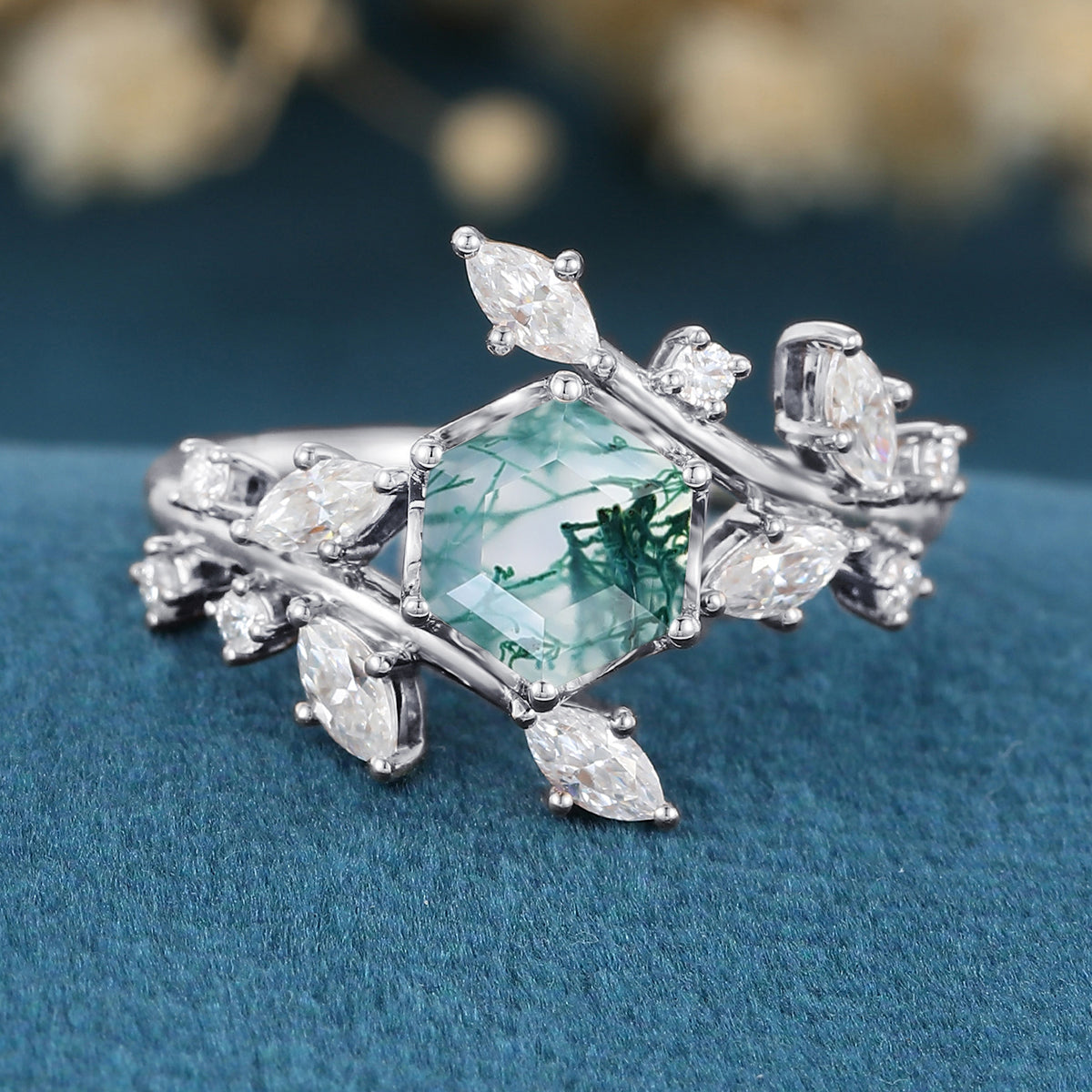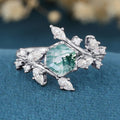 Nature Inspired Hexagon cut Moss Agate Engagement Ring