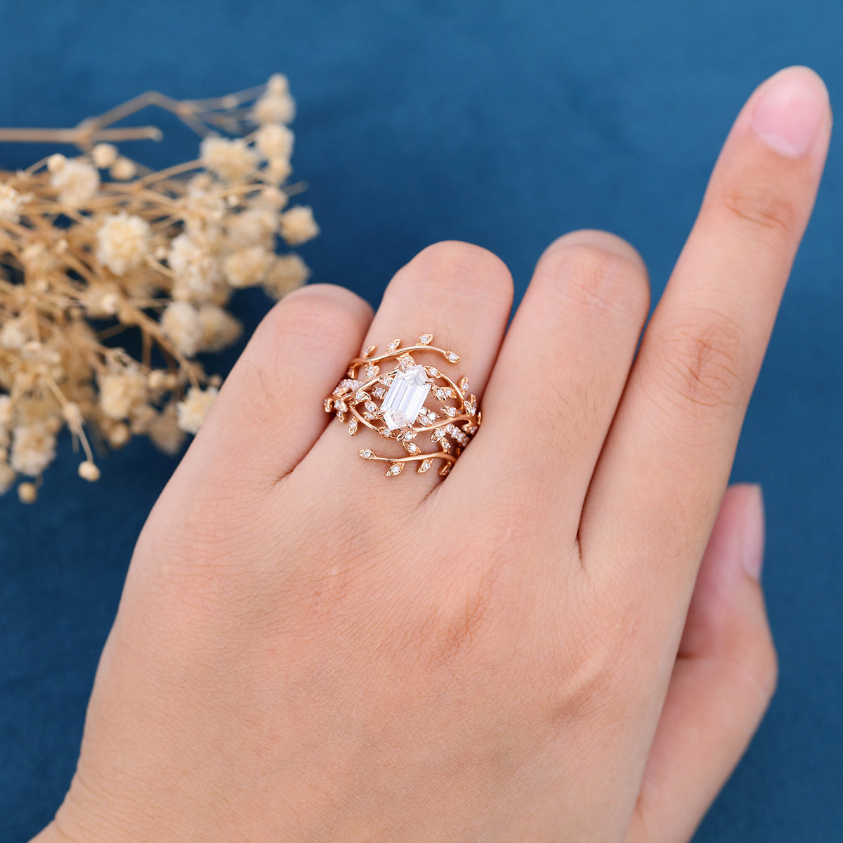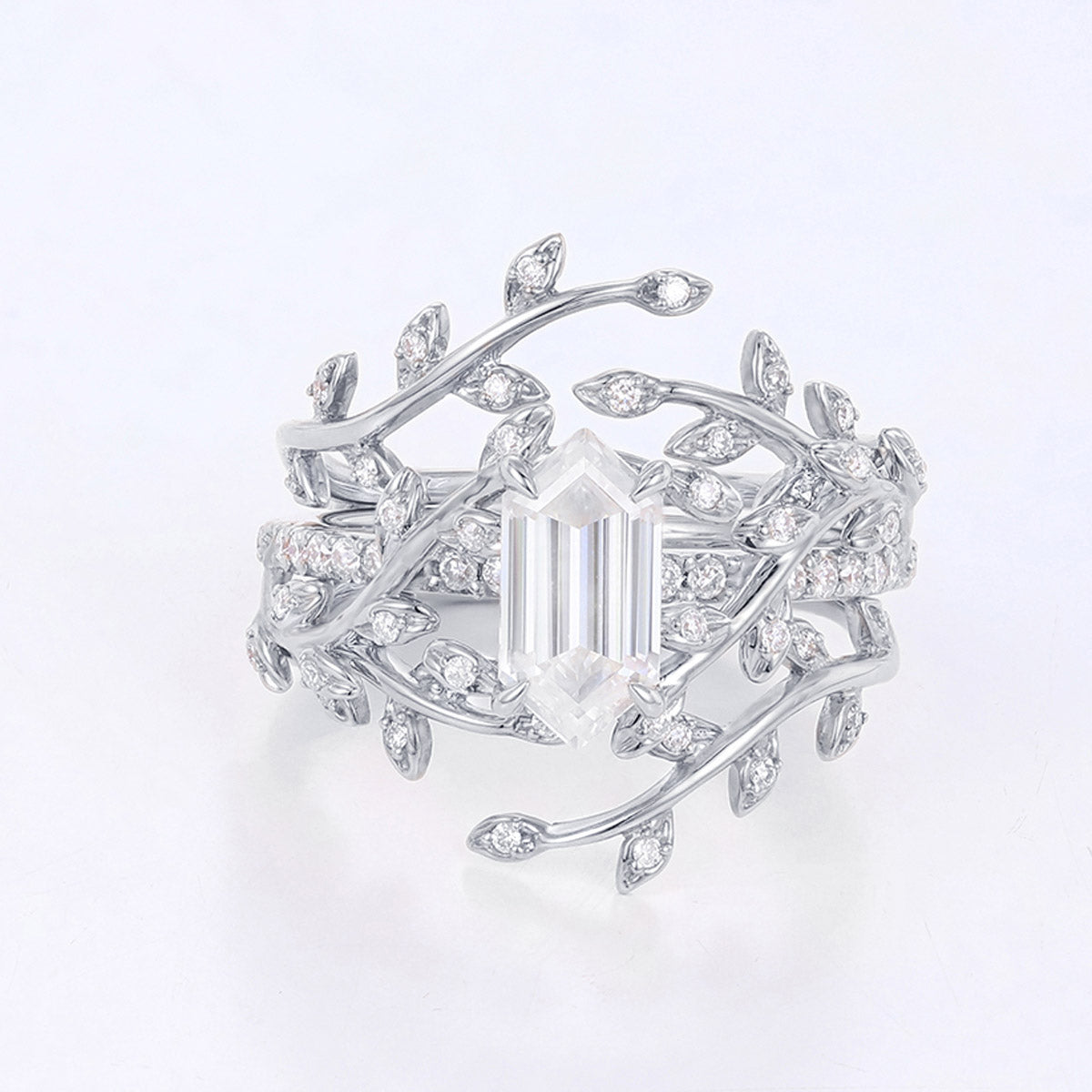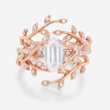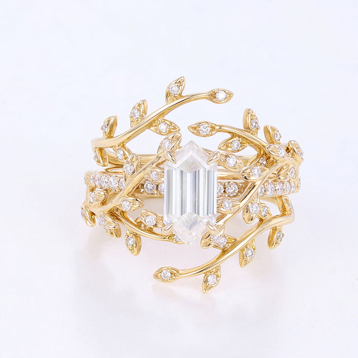 Nature Inspired Long Hexagon cut Moissanite Leaf Gold ring set