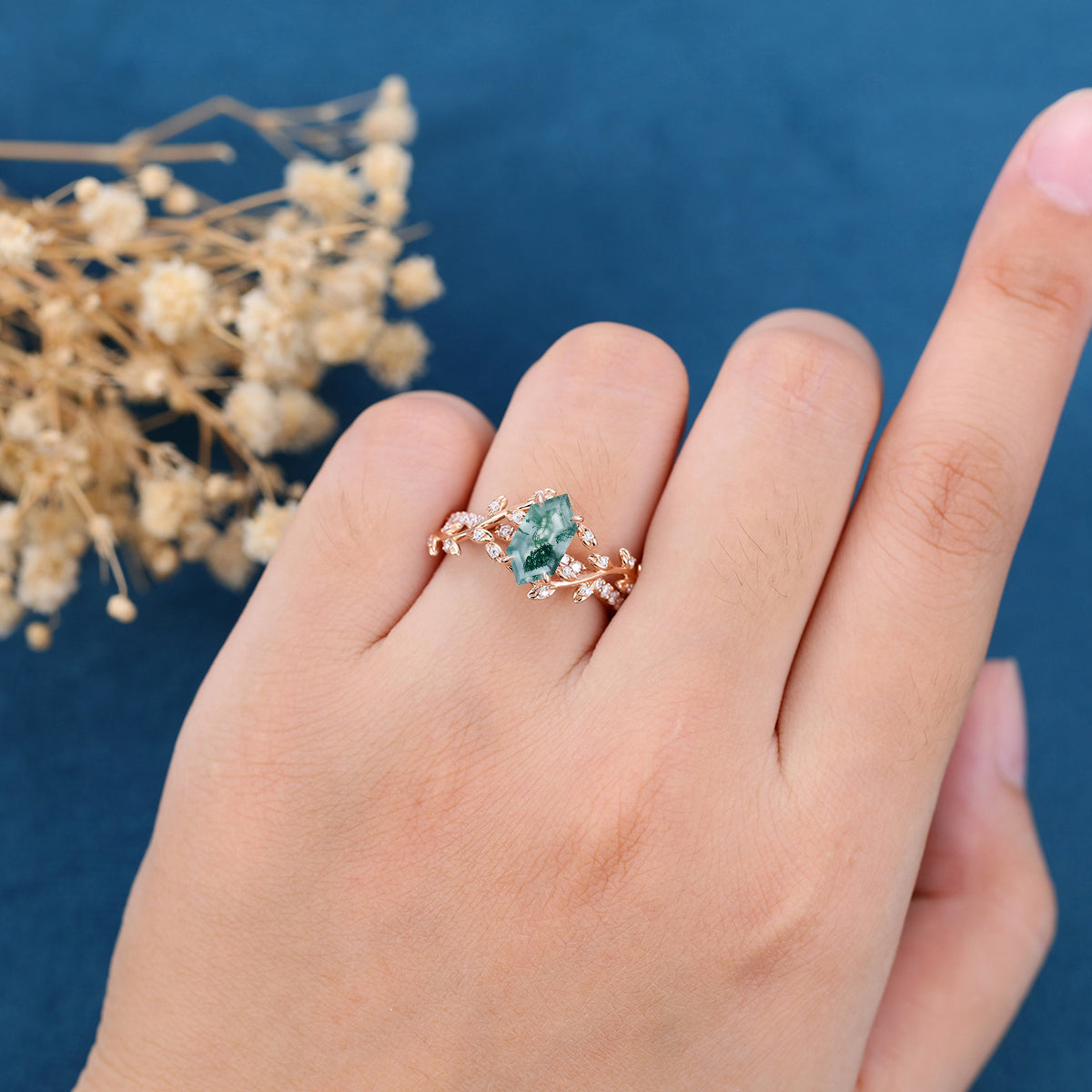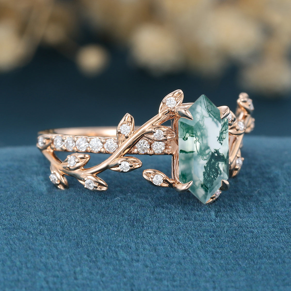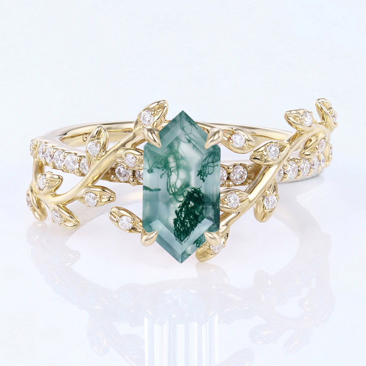 Nature Inspired Long Hexagon cut Moss Agate Leaf Gold Engagement Ring