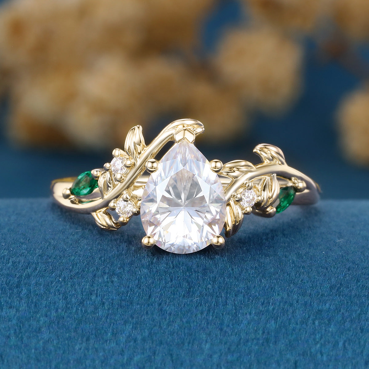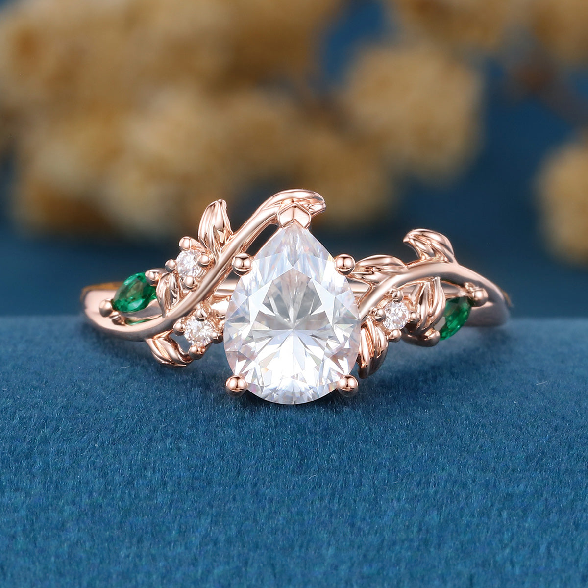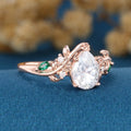 Nature Inspired Pear cut Moissanite + Lab Emerald Engagement Ring