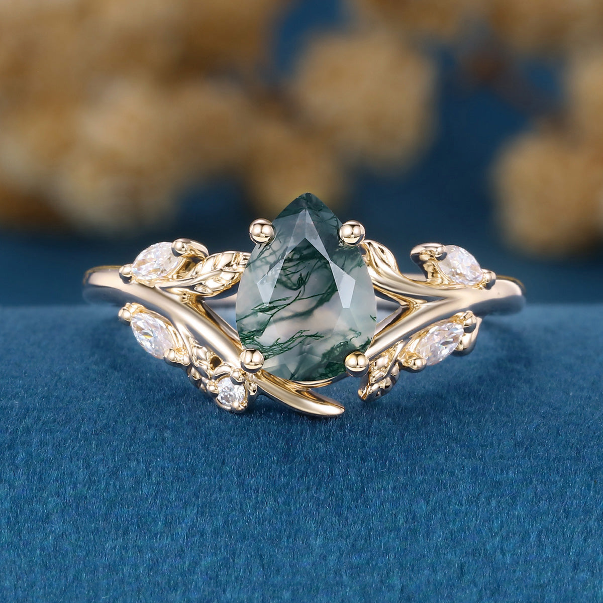 Nature Inspired Pear cut Moss agate Engagement Ring